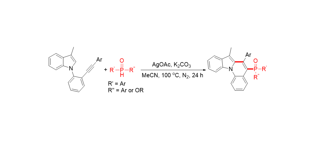 首次以二芳基氧化膦(含膦酸酯)为原料, 与吲哚炔反应合成非共平面的二芳基膦酰基吲哚并[1,2-a]喹啉. 该方法涉及银介导的串联加成和环化过程, 包括具有显著位阻的二芳基膦酰基自由基的生成和后续吲哚炔的自由基环化. 该方案具有反应条件比较温和及操作简便等显著优势, 可合成多种非共平面二芳基膦酰基吲哚并[1,2-a]喹啉, 产率中等到良好. 这些化合物在医药和材料科学领域具有重要的应用潜力.