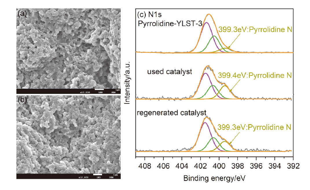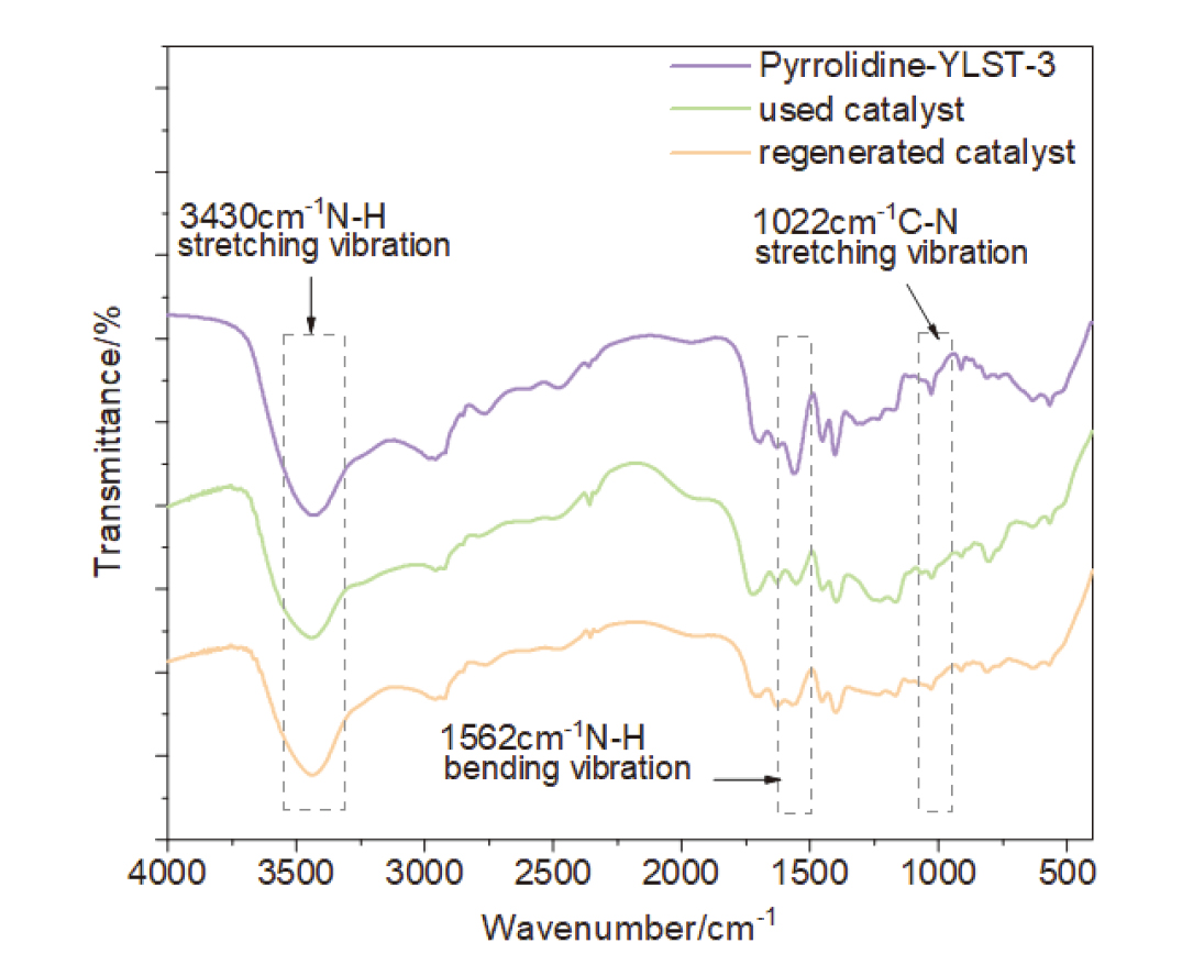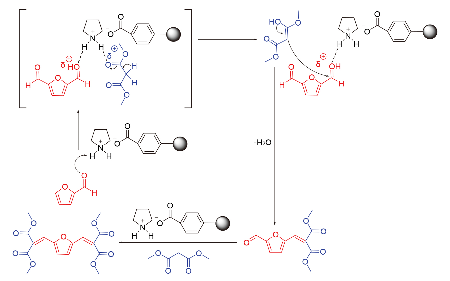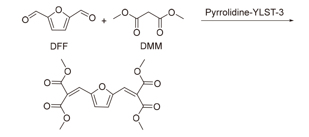 本工作以弱酸性离子交换树脂为载体, 以有机胺为修饰剂, 通过简单的酸碱中和反应制备得到了一系列负载型离子液体催化剂, 并将其应用到生物基多元酸酯的制备当中. 以2,5-呋喃二甲醛(DFF)和丙二酸二甲酯(DMM)为底物, 以活性最佳的Pyrrolidine-YLST-3为催化剂时, 生物基多元酸酯的产率可以达到99.2%. 这种制备方法极大地减少了传统氧化过程中氧气等强氧化剂的使用, 安全性更高, 对设备要求较低. 此外, 目标产物选择性较高, 副产物主要为水, 对环境更加友好, 更加符合绿色化学原则. 通过核磁共振(NMR)、红外光谱(FTIR)、X射线衍射(XRD)和X射线光电子能谱(XPS)等方法对催化剂进行了表征, 发现吡咯烷与离子交换树脂之间发生了质子转移, 形成了新的负载型离子液体. 通过对多种底物的Knoevenagel缩合反应进行研究均取得了较高的收率, 说明Pyrrolidine-YLST-3催化剂具有很强的普适性.