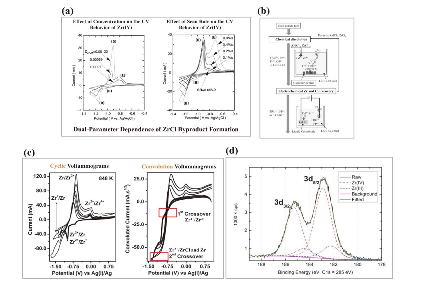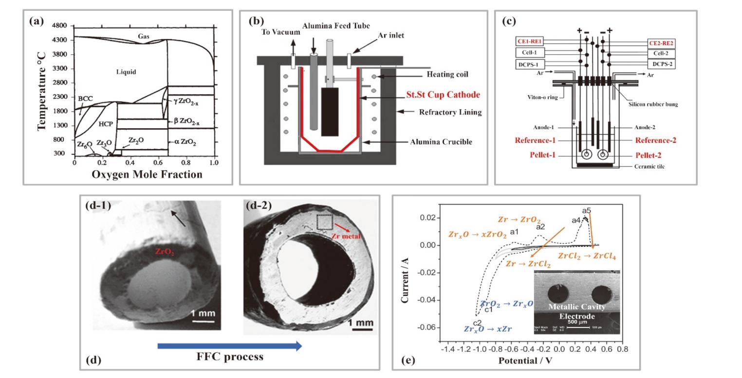 | Swaroop[ | 1966 | EFM | NaCl-KCl-ZrCl2 NaCl-KCl-ZrCl2-ZrCl3 NaCl-KCl-ZrCl3-ZrCl4 | Zr(IV)→Zr(III)→Zr(II)→Zr(0) | 670~740 |