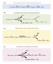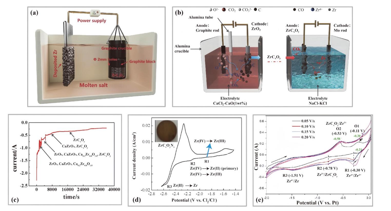 | Wang[ | 2023 | CV | NaCl-KCl-K2ZrF6 | Pathway 1: Zr(IV)→Zr(III)→Zr(II)→Zr(0) Pathway 2: Zr(IV)→Zr(0) | 750 |