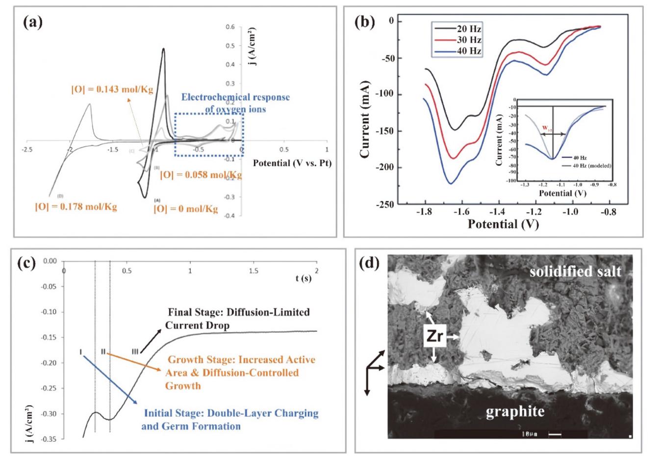 | Tekeda[ | 2018 | CV and SWV | NaCl-KCl-ZrCl4 | Pathway 1: Zr(IV)→Zr(II)→Zr(0) Pathway 2: Zr(IV)→Zr(0) | 800 |