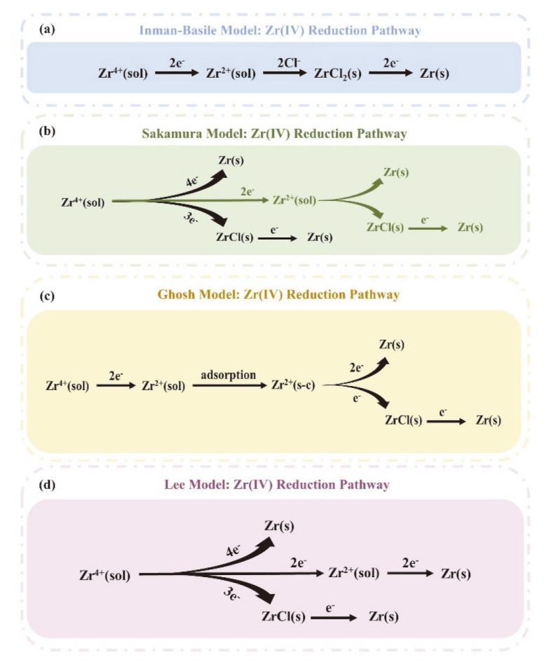 | Sakakura[ | 1976 | CP | NaCl-KCl-ZrCl2 NaCl-KCl-ZrCl4 | Zr(IV)→Low Valency→Zr(0) | 700~900 |