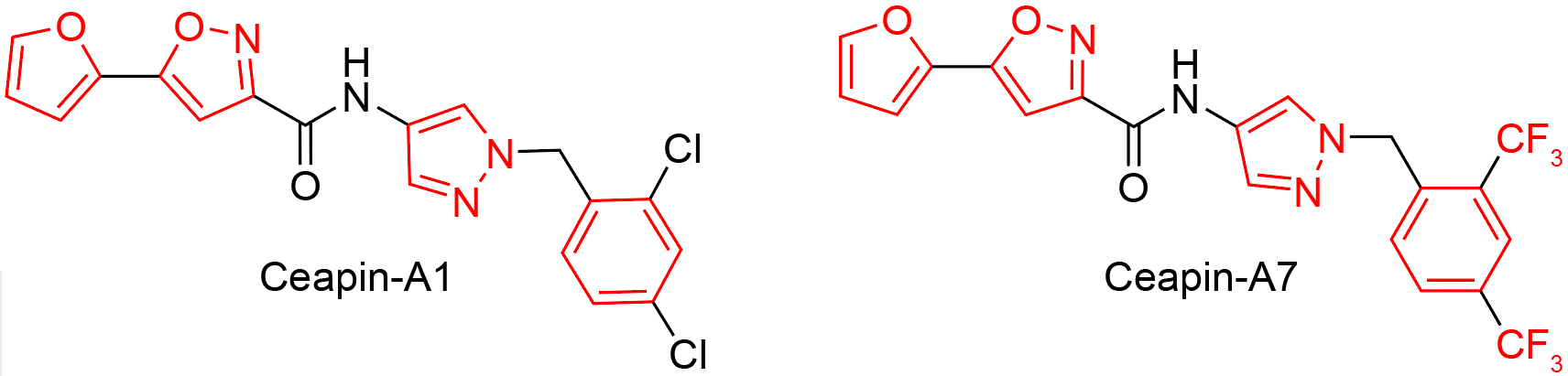 表4 直接靶向AP-1转录因子的小分子抑制剂. 蓝色代表CP1(3~7)位氨基酸. 红色代表关键功能基团Table 4 Small molecule inhibitors directly targeting AP-1 transcription factors. Blue represent amino acids at position CP1(3~7). Red represent a critical functional group |