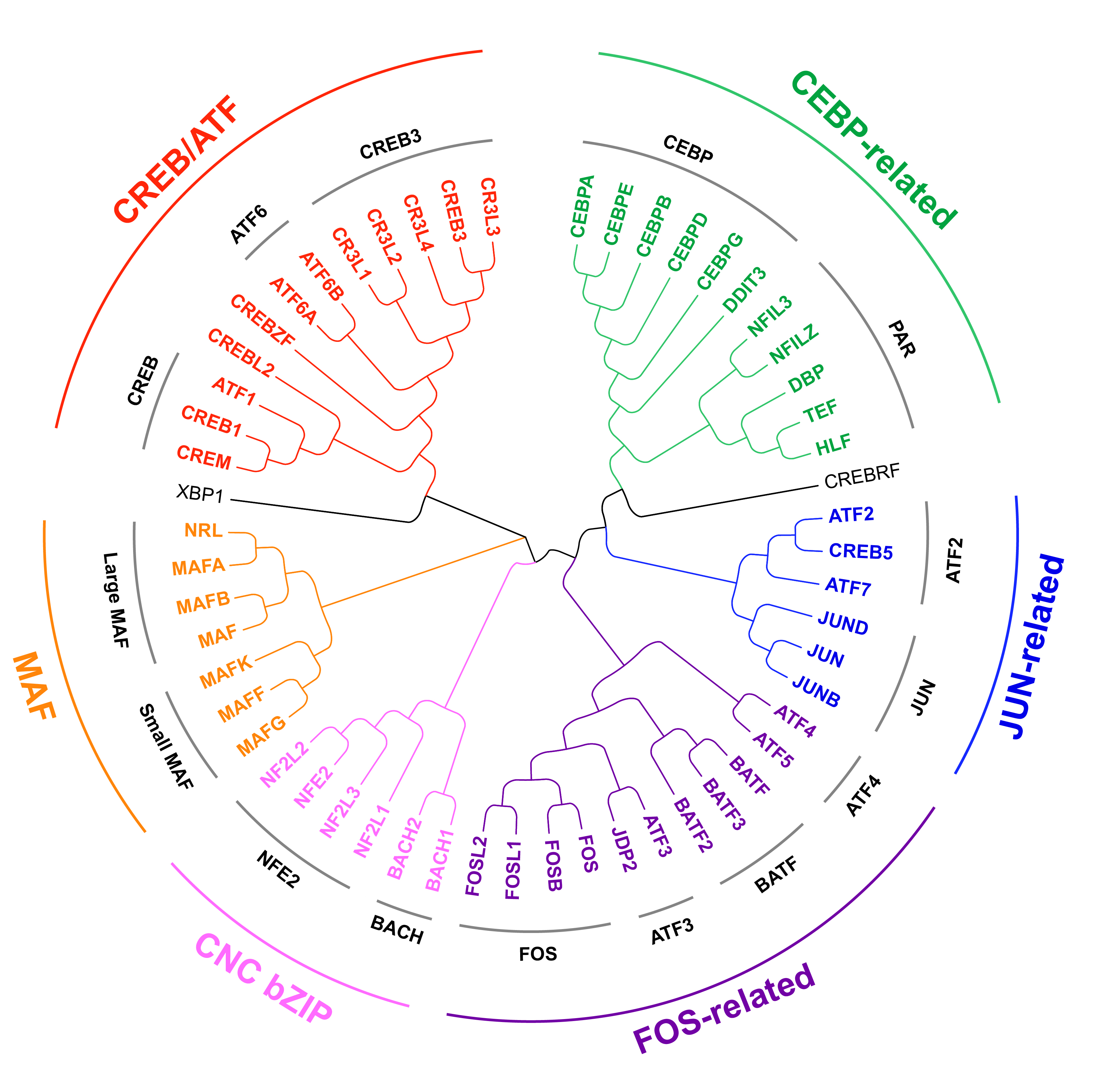 图1 人类基因组bZIP转录因子家族进化树, 由MEGA软件生成. 红色字为CREB/ATF家族. 绿色字为CEBP相关家族. 蓝色字为JUN相关家族. 紫色字为FOS相关家族. 淡紫色为CNC bZIP家族. 橙色字为MAF家族. 圆弧上黑色字为亚家族分类. 转录因子黑色字为独立分类.Figure 1 Likelihood tree of bZIP transcription factors in the human genome, built by MEGA. CREB/ATF transcription factors in red. CEBP-related transcription factors in green. JUN-related transcription factors in blue. FOS-related transcription factors in purple. CNC bZIP transcription factors in light purple. MAF transcription factors in orange. Subfamilies are classified in black on the arc. XRP1 and CREBRF are classified independently. |