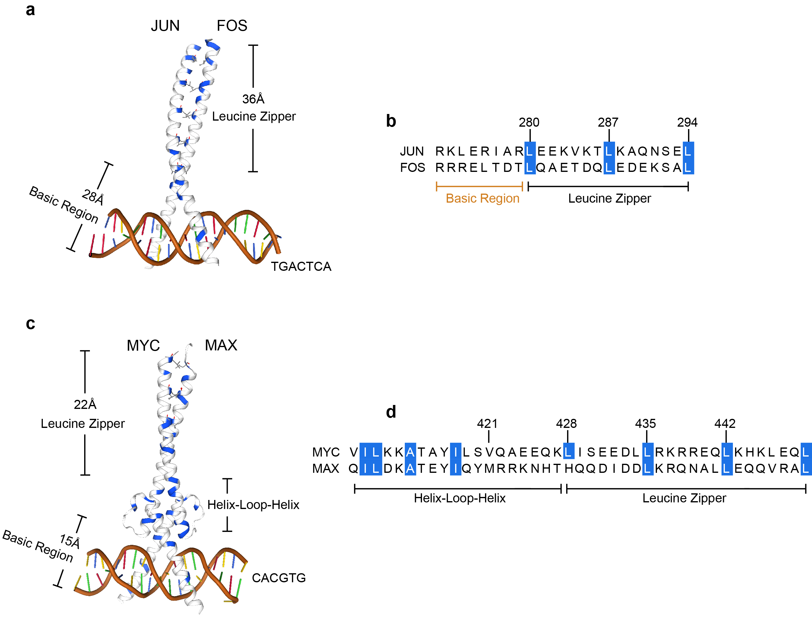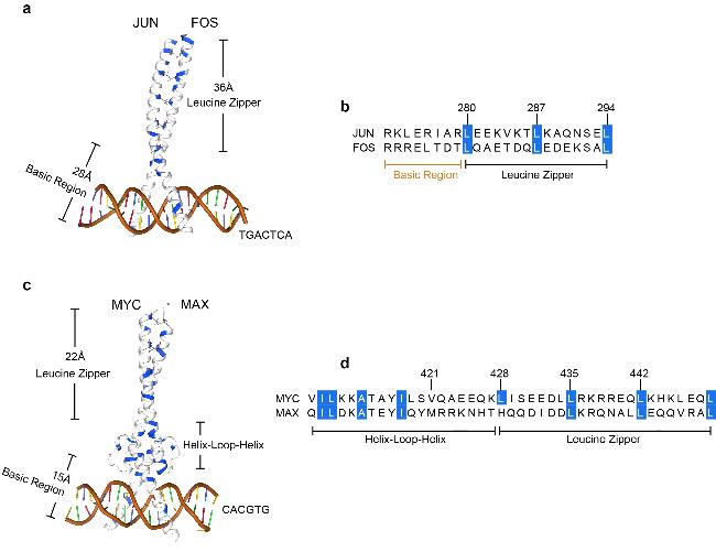 图2 bZIP转录因子JUN和FOS的二聚体复合物; bHLH-LZ转录因子MYC和MAX的二聚体复合物. (a) JUN和FOS的二聚体结合DNA的晶体结构(PDB: 1fos)[6]. JUN的bZIP区域(252aa~315aa)由64个氨基酸构成, 其中碱性区域占28个, LZ区域占36个. FOS的bZIP区域(137aa~220aa)长度均与JUN一致. 疏水氨基酸用蓝色标注. 碱性区域直接与DNA(红色)相互作用, 识别5'-TGACTCA-3'基序. (b) JUN和FOS的碱性区域与LZ区域连接处的氨基酸构成. 蓝色标注为符合拉链性质的疏水氨基酸位点. (c) MYC和MAX的二聚体结合DNA的晶体结构(PDB: 1nkp)[7]. MYC的bHLH-LZ区域(369aa~449aa)由81个氨基酸构成, 其中碱性区域占15个, HLH区域占44个, LZ区域占22个. MAX的bHLH-LZ区域(23aa~102aa)由80个氨基酸构成, 其中碱性区域相比MYC缺少位于首位的一个疏水氨基酸, 其余长度与MYC一致. 疏水氨基酸用蓝色标注. 碱性区域直接与DNA(红色)相互作用, 识别5'-CACGTG-3'基序[7]. (d) MYC和MAX的HLH区域与LZ区域连接处的氨基酸构成. LZ区域蓝色标注为符合拉链性质的疏水氨基酸位点, HLH区域蓝色标注为疏水氨基酸. (a), (c)由pymol软件绘制. (b), (d)由MEGA软件绘制, 序列来自Uniprot.Figure 2 Dimeric complex of the bZIP transcription factor JUN and FOS; dimeric complex of the bHLH-LZ transcription factor MYC and MAX. (a) Crystal structure of the dimer-bound DNA of JUN and FOS (PDB: 1fos)[6]. The bZIP domain (252aa~315aa) of JUN consists of 64 amino acids, of which the basic region accounts for 28 and the LZ region for 36. The length of the bZIP domain (137aa~220aa) of FOS are all consistent with JUN. Hydrophobic amino acids are labeled in blue. The basic region interacts directly with DNA (red) and recognizes the 5'-TGACTCA-3' motif. (b) Amino acid composition of the basic region of JUN and FOS at the junction with the LZ region. Hydrophobic amino acid sites consistent with zipper properties are labeled in blue. (c) Crystal structure of the dimer-bound DNA of MYC and MAX (PDB: 1nkp)[7]. The bHLH-LZ domain (369aa~449aa) of MYC consists of 81 amino acids, of which 15 are basic, 44 are HLH, and 22 are LZ regions. The bHLH-LZ region of MAX (23aa~102aa) consists of 80 amino acids, of which the basic region lacks one hydrophobic amino acid located in the first position compared to MYC, and the rest of the length is consistent with MYC. Hydrophobic amino acids are labeled in blue. The basic region interacts directly with DNA (red) and recognizes the 5'-CACGTG-3' motif. (d) Amino acid composition of the HLH region of MYC and MAX at the junction with the LZ region. The LZ region is labelled in blue as a hydrophobic amino acid site consistent with zipper properties, and the HLH region is labelled in blue as a hydrophobic amino acid pair. (a), (c) Built by pymol. (b), (d) Built by MEGA with sequences from Uniprot. |