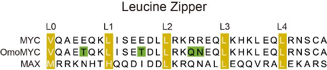 图8 OmoMYC与MYC和MAX序列对比. 图中黄色标为LZ区域的疏水氨基酸, 绿色标为OmoMYC与MYC相比, 氨基酸的具体突变位置[413].Figure 8 Comparison of OmoMYC with MYC and MAX sequences. The hydrophobic amino acids of LZ region are shown in yellow, and the specific amino acid mutation positions of OmoMYC compared to MYC are shown in green. |