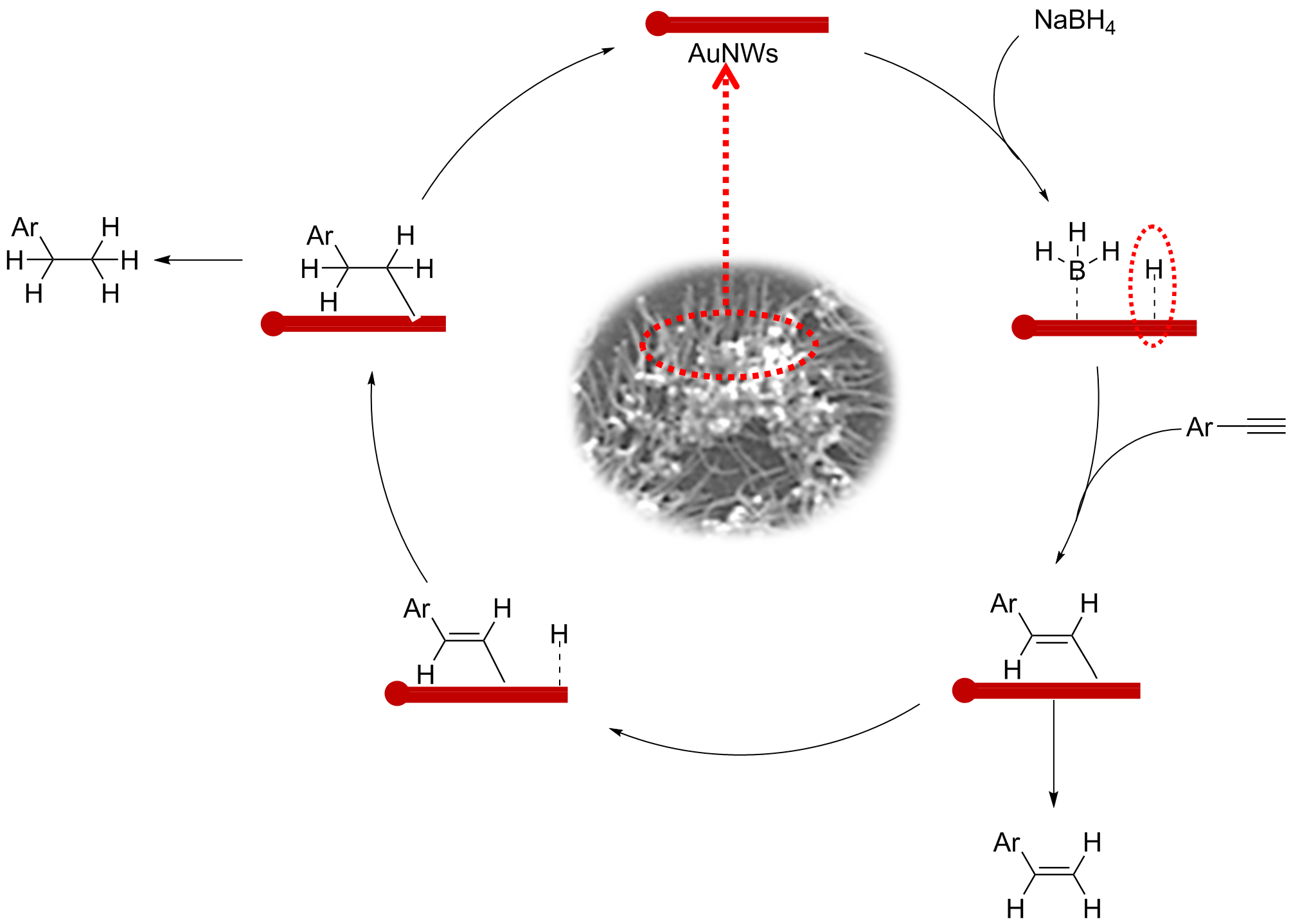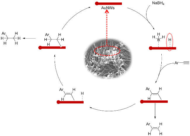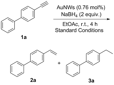 a Reaction conditions: 4-ethynyl-1,1'-biphenyl (17.8 mg, 0.1 mmol), NaBH4 (7.56 mg, 2 equiv.) and AuNWs with 452±12 nm length (0.15 mg, 0.76 mol%) were mixed in EtOAc (1.5 mL) and stirred at room temperature for 4 h. b By HPLC analysis. |