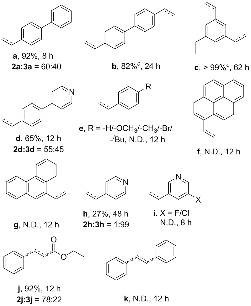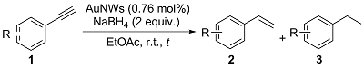 a Reaction conditions: aryl alkynes (0.1 mmol), AuNWs with 452±12 nm length (0.15 mg, 0.76 mol%) and NaBH4 (7.56 mg, 2 equiv.) were mixed in EtOAc (1.5 mL) and stirred at room temperature. b Overall yields and product ratios were determined by HPLC analysis. c A mixture of various hydrogenation products. N.D.=not detected. |