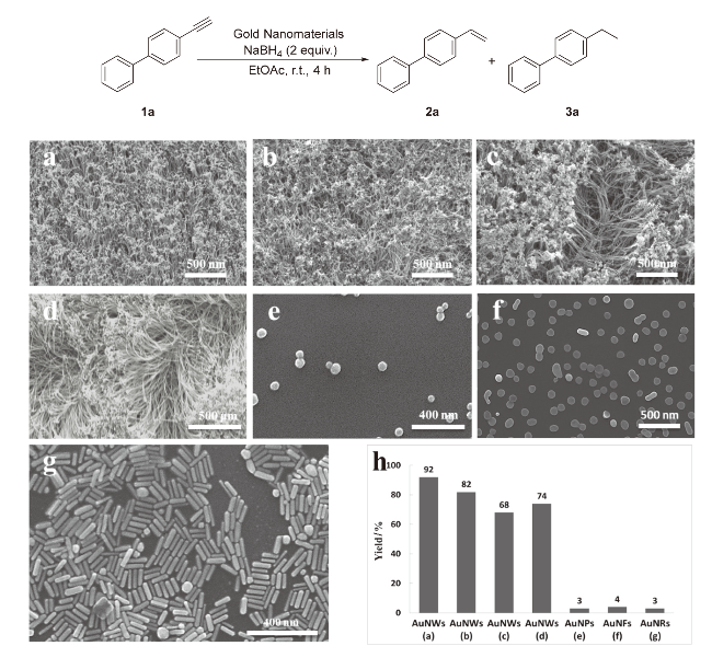 图1 使用1,3,5-三乙炔基苯配体制备的长度为(a) 452±12 nm、(b) 1338±34 nm和(c) 2446±63 nm的AuNWs的扫描电子显微镜(SEM)图; (d)使用3-巯基苯甲酸(3-MBA)配体制备的长度为1000±23 nm的AuNWs的SEM图; (e) 60 nm 的AuNPs的SEM图; (f)长度为100 nm的AuNFs的SEM图; (g)长度为115 nm的AuNRs的SEM图; (h) 金纳米材料的催化效率(催化剂用量约为0.76 mol%), 总产率为烯烃(2a)和烷烃(3a)的HPLC产率之和(测量3次取平均值)Figure 1 SEM images of AuNWs with (a) 452±12 nm length, (b) 1338±34 nm length, and (c) 2446±63 nm length using 1,3,5-triethynylbenzene ligand, and (d) 1000±23 nm length using 3-mercaptobenzoic acid (3-MBA) ligand; SEM images of (e) 60 nm AuNPs, (f) 100 nm (length) AuNFs, and (g) 115 nm (length) AuNRs; (h) catalytic efficiency of gold nanomaterials (catalyst loading of 0.76 mol%). The yield is overall HPLC yield of alkenes (2a) and alkanes (3a) (average value of 3 times) |