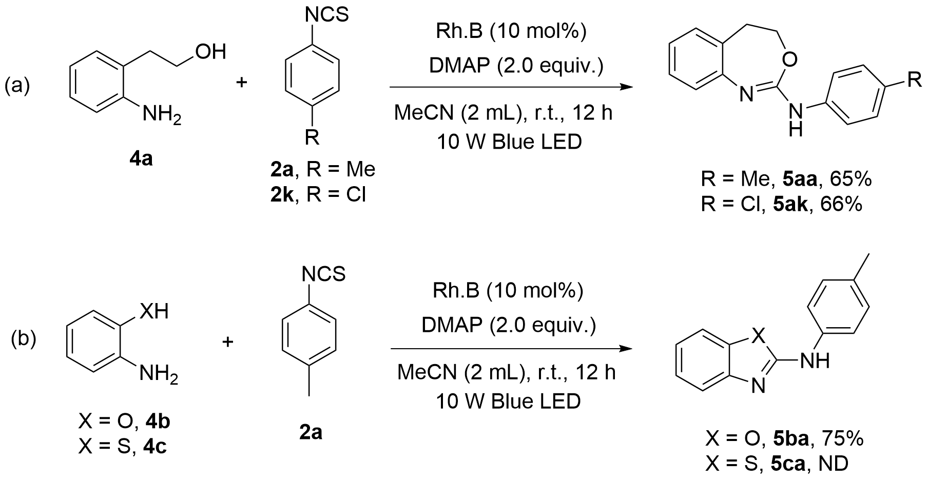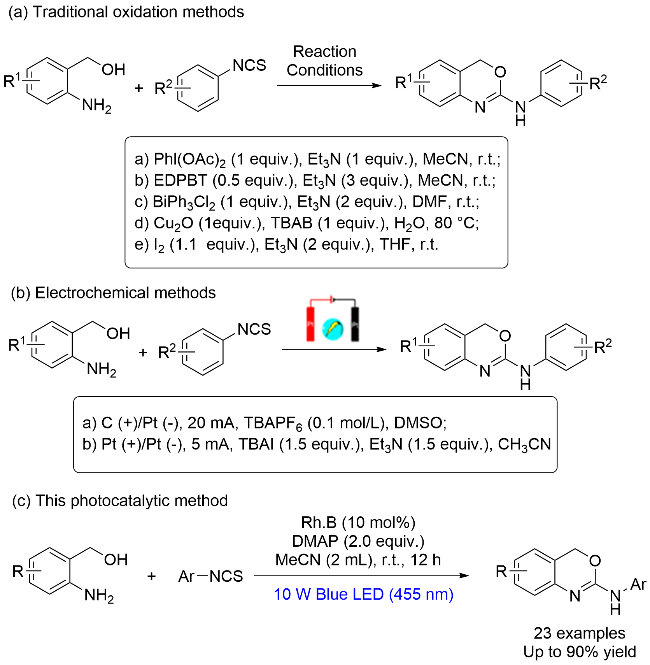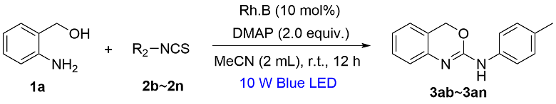 表1). 初始反应体系采用10 mol%的罗丹明B (Rh.B)为光催化剂、4-二甲氨基吡啶(DMAP)为碱、