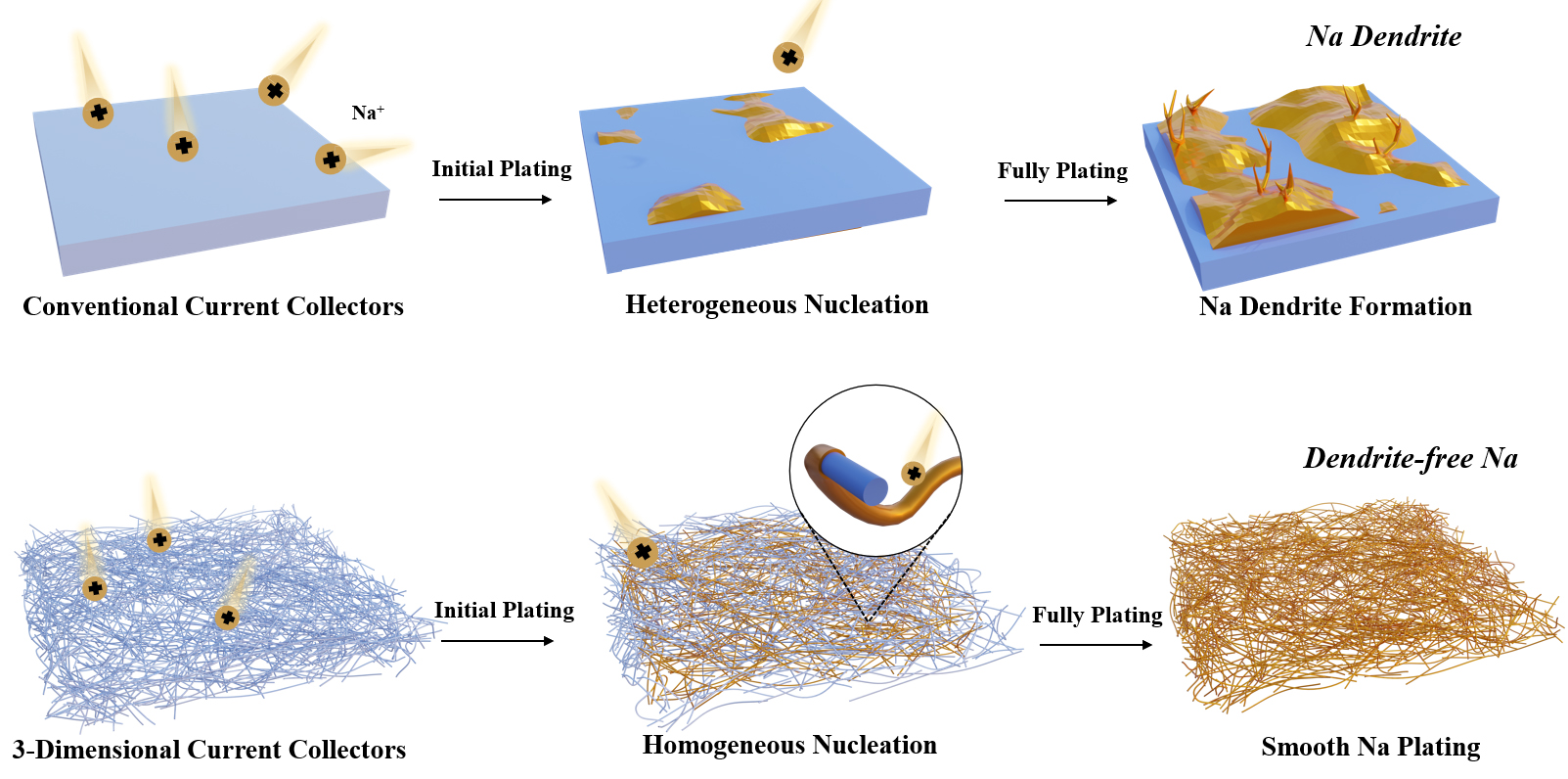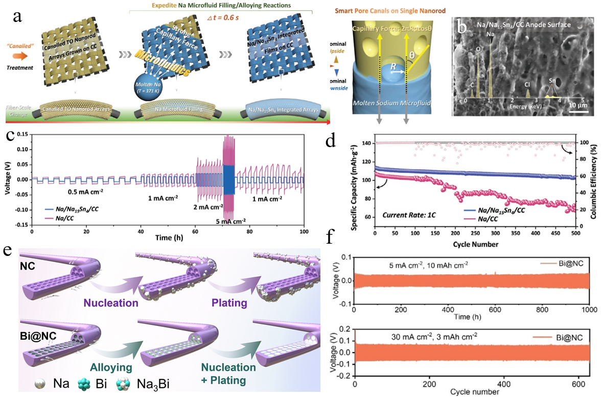 图6 (a, b) 具有毛细上升特性的Na/Na15Sn4/CC示意图和循环测试后的SEM图、(c, d) Na/CC和Na/Na15Sn4/CC对称电池倍率性能以及与NVP组成的全电池在1C下的长循环性能图以及(e, f) NC和Bi@NC上Na沉积比较的示意图和Bi@NC在5 mA•cm-²和10 mA•h•cm-²下以及在30 mA•cm-²和3 mA•h•cm-²的循环性能[36-37]Figure 6 (a, b) Schematic illustration of the Na/Na₁₅Sn₄/CC composite exhibiting capillary-rise behavior, together with post-cycling SEM micrographs, (c, d) rate-capability data for Na/CC and Na/Na₁₅Sn₄/CC symmetric cells, and long-term cycling performance (1C) of the corresponding full cells paired with NVP cathodes, (e, f) schematic comparison of Na deposition on NC and Bi@NC, together with the cycling performance of Bi@NC at 5 mA•cm-² with a capacity of 10 mA•h•cm-² and at 30 mA•cm-² with 3 mA•h•cm-²[36-37] |
