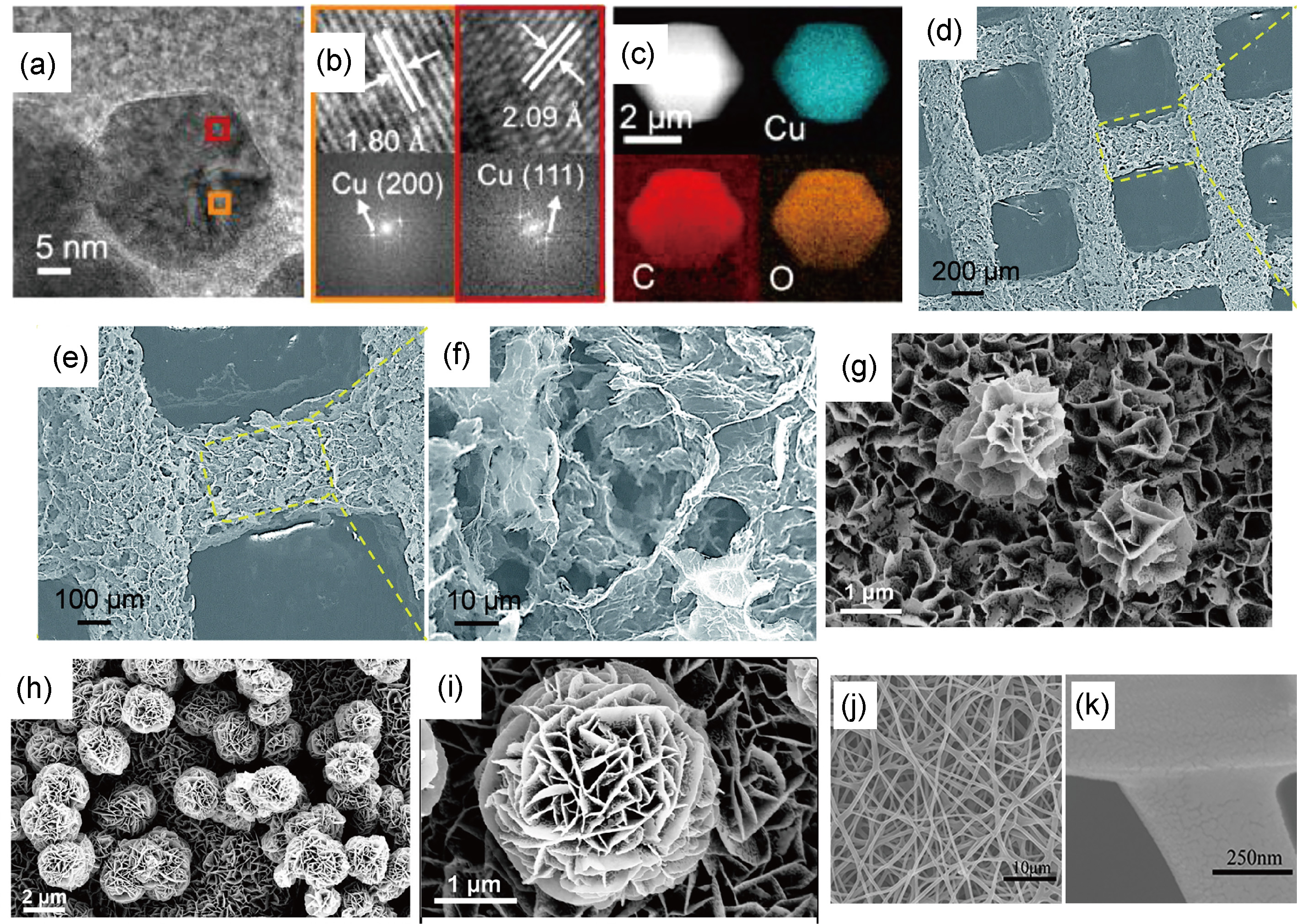 图3 (a~c)准铜 MOF 的透射电子显微镜(TEM)图、晶格图和元素分布图、(d~f) 3DP-NGA 在不同放大倍数下的扫描电子显微镜(SEM)图像、(g~i)掺锰介孔碳材料的SEM图像以及(j, k)木质素碳纳米纤维的场发射扫描电镜图像[11-14]Figure 3 (a~c) TEM images, lattice images, and element distribution maps of quasi-copper MOF, (d~f) SEM images of 3DP-NGA at different magnifications, (g~i) SEM images of manganese-doped mesoporous carbon materials, and (j, k) FE-SEM images of lignin carbon nanofibers [11-14] |