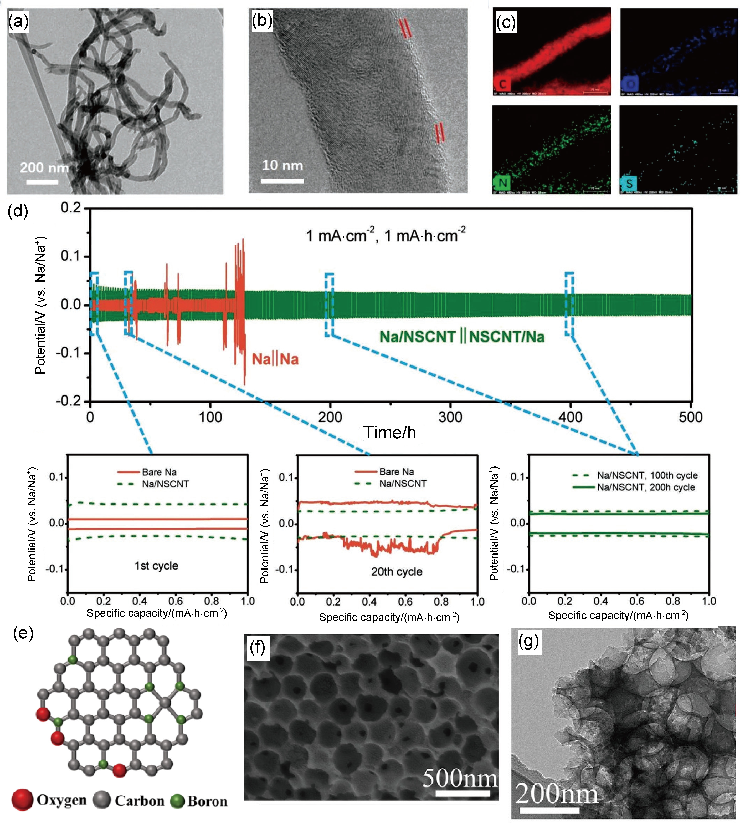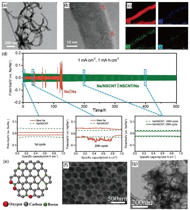 图5 (a~d) NSCNT 的 TEM 以及对应元素分布图以及1 mA•cm-2下的恒电流循环电压曲线、(e) OBHcCs中碳氧硼共掺杂的结构示意图和(f, g) OBHcCs的SEM图和TEM图[29-30]Figure 5 (a~d) TEM images of NSCNT and its corresponding elemental distribution maps, and the constant-current cycling voltage curves of NSCNT at 1 mA•cm-², (e) the configuration of carbons with oxygen and boron codoping, and (f, g) SEM images, TEM images of OBHcCs[29-30] |