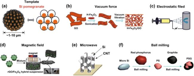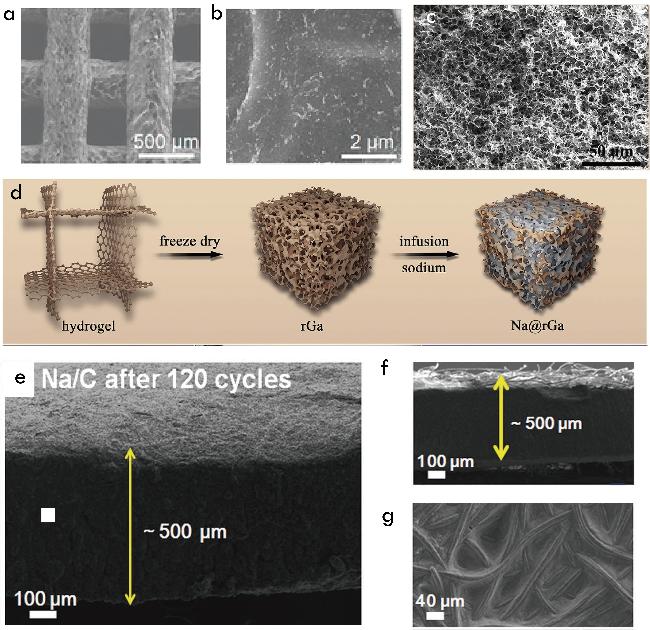 图4 (a, b) 3D打印rGO/金刚石-30微格气凝胶的SEM图、(c) rGa负极SEM图像、(d) Na@rGa复合负极制备流程图及(e~g) Na/C复合材料的SEM图像[21,23-24]Figure 4 (a, b) SEM images of 3DP rGO/diamane-30 microlattice aerogel, (c) SEM image of rGa anode, (d) schematic diagram of the preparation process of Na@rGa composite anode, and (e~g) SEM image of Na/C composite[21,23-24] |
