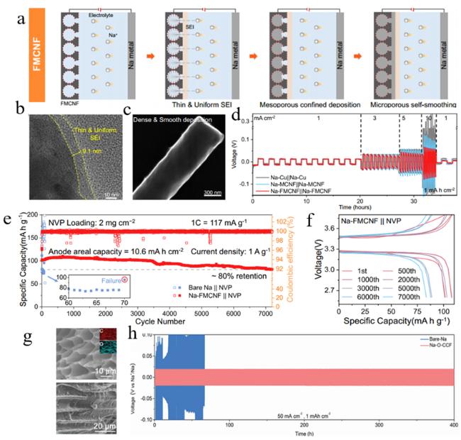 图7 (a) FMCNF上Na沉积机制的示意图、(b, c) FMCNF的TEM图和SEM图、(d~f) 不同电流密度下对称电池的性能图、与NVP组成全电池的长循环性能图和对应的电压容量曲线以及(g, h) O-CCF的SEM图和Na-O-CCF在50 mA•cm-2电流密度下的循环稳定性图[44-45]Figure 7 (a) Schematic illustration of Na deposition behavior on FMCNF, (b, c) TEM and SEM images of FMCNF, (d~f) Symmetric-cell performance at various current densities, long-term cycling data of the full cell coupled with an NVP cathode, and corresponding voltage-capacity profiles, (g, h) SEM image of O-CCF and cycling stability of the Na-O-CCF electrode at 50 mA•cm-2 [44-45] |