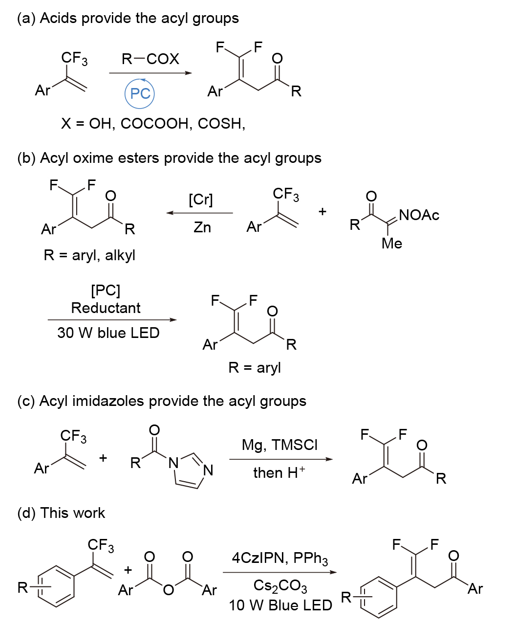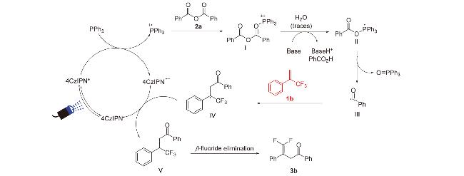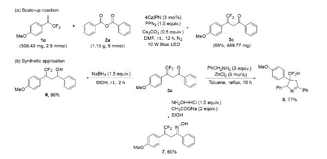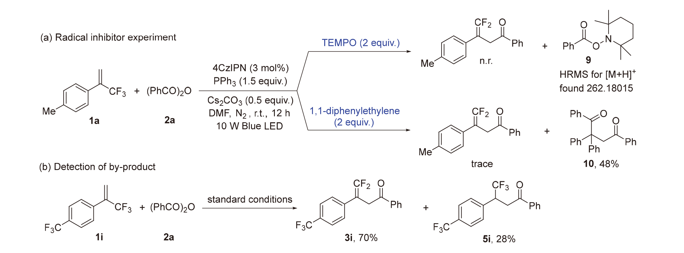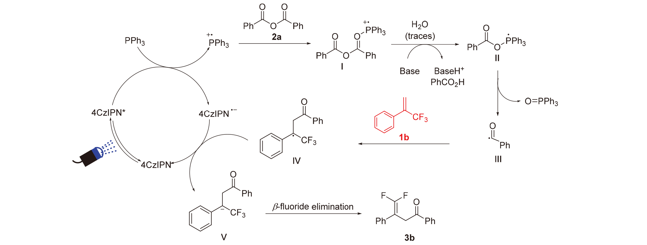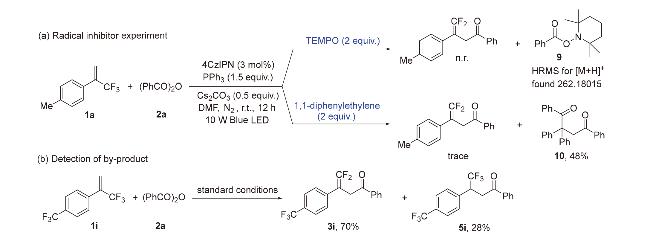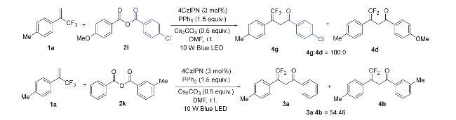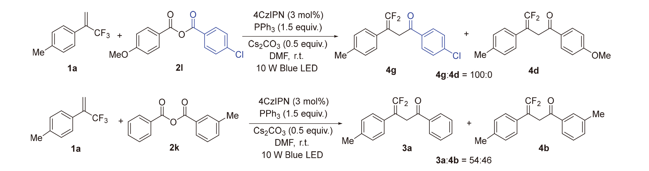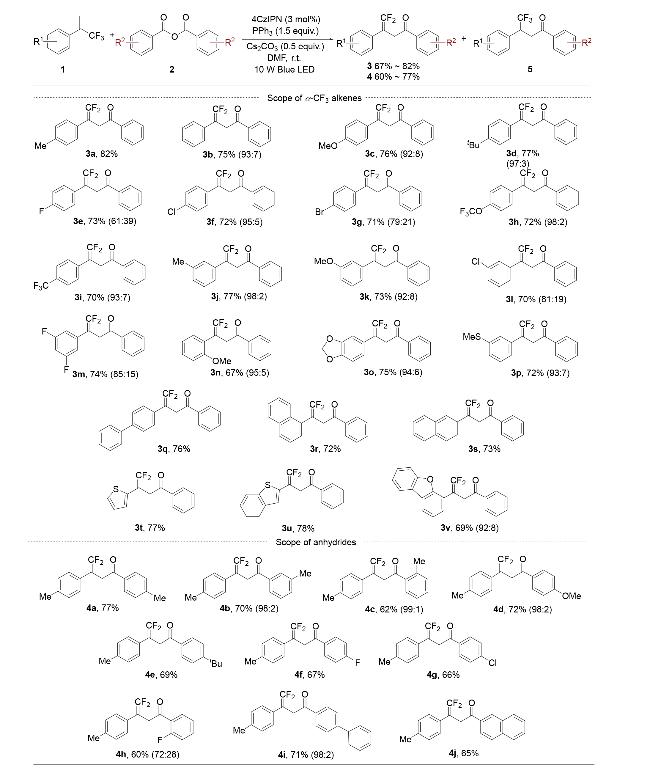 图3 底物范围Figure 3 Substrate scope a Reaction conditions: 1a~1v (0.3 mmol), 2a~2j (0.6 mmol), 4CzIPN (0.009 mmol), PPh3 (0.45 mmol), and Cs2CO3 (0.15 mmol) in DMF (3 mL) under 10 W blue LED light, under nitrogen atmosphere at room temperature for 12 h; the ratio of product 3 or 4 to byproduct 5 is given in parentheses, determined by 19F NMR. b Isolated yield. |