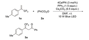 a Unless otherwise noted, the standard reaction conditions were as follows: 1a (0.15 mmol), 2a (0.3 mmol), PC (0.0045 mmol), Ph3P (0.225 mmol), and base (0.075 mmol) in solvent (1.5 mL) with irradiation by 10 W Blue LEDs (λ=455~460 nm) under N2 at room temperature for 12 h. b Isolated yield. N.R.: no reaction. |