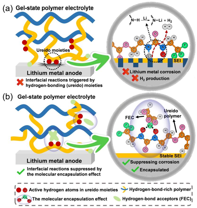 图4 富含氢键的凝胶聚合物电解质与锂金属负极(LMAs)发生界面反应的示意图. (a)富含氢键的凝胶聚合物电解质与LMAs存在着严重的界面副反应; (b)通过分子封装效应可以抑制富含氢键的凝胶聚合物电解质与LMAs的界面副反应[43]Figure 4 Schematics of interfacial reactions between hydrogen-bond-rich gel-state polymer electrolytes and LMAs. (a) The severe interfacial reactions between hydrogen-bond-rich electrolytes and LMAs. (b) The interfacial reactions between hydrogen-bond-rich electrolytes and LMAs are suppressed via the molecular encapsulation effect. Reprinted with permission from Ref.[43] Copyright 2024, Wiley-VCH |