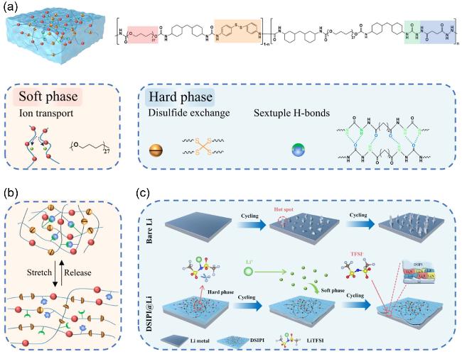 图8 (a)具有高韧性、自修复功能和弹性的动态超分子聚氨酯-脲(DSP-n)的结构设计和机理示意图; (b)分子链段在拉伸过程的运动示意图; (c) Li在裸Li和动态超分子聚氨酯-脲界面(DSIPI)@Li上的沉积示意图, 说明了DSIPI用于无枝晶和高效LMA的机制[21]Figure 8 (a) Structural design and mechanism diagram of DSP-n featuring high toughness, self-healing capabilities, and stretchability. (b) Schematic diagram illustrating the movement of polymer chain segments during the stretching process. (c) Schematic of Li plating/stripping on bare Li and DSIPI@Li anodes, revealing the mechanism of action of DSIPI for a dendrite-free and efficient Li metal anode. Reprinted with permission from Ref.[21] Copyright 2024, Wiley-VCH |