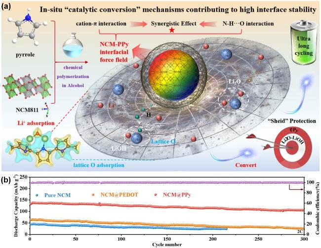 图2 (a) PPy包覆NCM正极材料的结构设计及原理示意图, (b)纯NCM、NCM@PEDOT、NCM@PPy在全固态金属锂电池中的循环性能对比 图[16]Figure 2 (a) The structural design and schematic diagram of PPy coated NCM cathode material, (b) The cycling performance of ASSLMBs paired with pure NCM, NCM@PEDOT, and NCM@PPy. Reprinted with permission from Ref.[16]. Copyright 2024, The Royal Society of Chemistry |