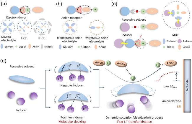 图3 显性和隐性溶剂化示意图. 基于电子给体的典型溶剂化壳结构(a)和阴离子受体(b), 两者溶剂化过程都会自发解离锂盐并参与溶剂化鞘的形成; 隐性溶剂和诱导剂的相互作用导致了隐形溶剂化(c); 通过分子对接激活隐性溶剂的机制(d)[35]Figure 3 Schematic of dominant and recessive solvation. Typical solvation shell structures based on the electron donor (a) and anion receptor (b), both of which spontaneously dissociate the salt and participate in the formation of the solvation sheath; recessive solvation enabled by the interacted recessive solvent and inducer (c); activation of the recessive solvent via molecular docking mechanism (d). Reprinted with permission from Ref.[35]. Copyright 2024, Springer Nature |