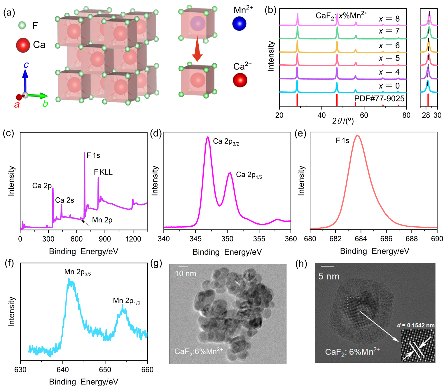 图1 (a) CaF2晶体结构; (b) CaF2:x%Mn2+ (x=0, 4, 5, 6, 7, 8)样品的XRD图及在27.5°~30°的局部放大图; (c) CaF2:6%Mn2+纳米颗粒的XPS全谱和(d) Ca、(e) F、(f) Mn的高分辨率谱; (g, h) CaF2:6%Mn2+纳米颗粒的TEM图Figure 1 (a) The crystal structure of CaF2. (b) XRD patterns of CaF2:x%Mn2+ (x=0, 4, 5, 6, 7, 8) samples and the enlarged patterns in the region of 27.5°~30°. (c) Full XPS spectrum of CaF2:6%Mn2+ nanoparticles and high-resolution XPS spectrum of (d) Ca, (e) F and (f) Mn. (g, h) TEM images of CaF2:6%Mn2+ nanoparticles |