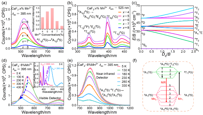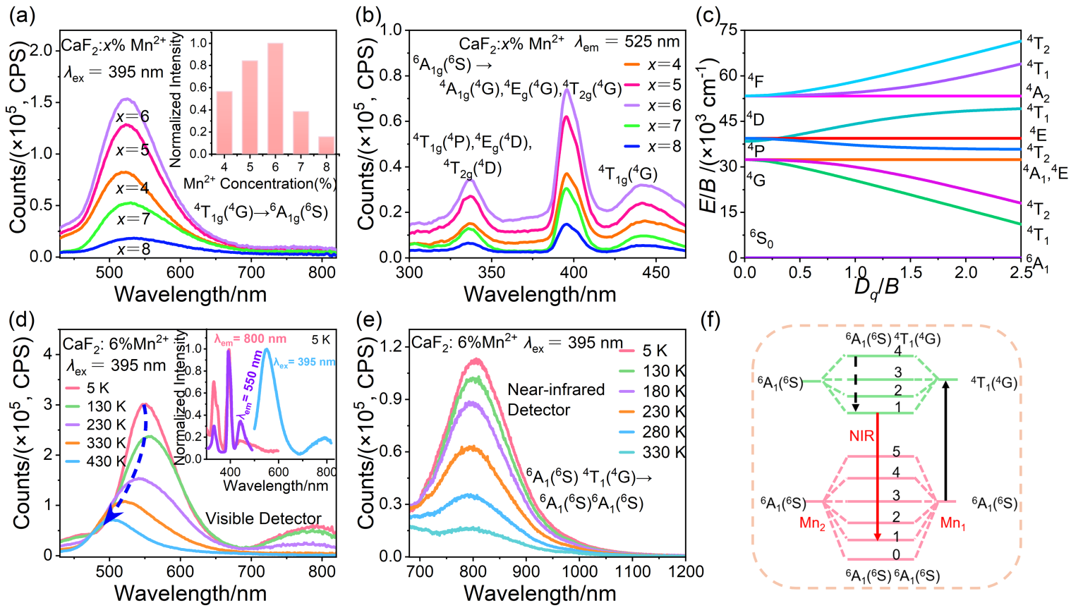图2 室温下CaF2:x%Mn2+ (x=4, 5, 6, 7, 8)纳米颗粒的(a) PL光谱(λex=395 nm)和(b) PLE光谱(λem=525 nm). (a)中插图为Mn2+浓度与525 nm处发射峰归一化强度的关系图; (c) Mn2+离子的田边-菅野能级图(E为能级能量, B为拉卡参数, Dq为晶体场强度); (d)可见和(e)近红外检测器测得的CaF2:6%Mn2+纳米颗粒PL光谱. (d)中插图为5 K时, 该纳米颗粒的归一化PLE (λem=550 nm, λem=800 nm)和PL (λex=395 nm)光谱; (f) Mn2+-Mn2+二聚体发光机理图Figure 2 (a) PL spectra (λex=395 nm) and (b) PLE spectra (λem=525 nm) of CaF2:x%Mn2+ (x=4, 5, 6, 7, 8) nanoparticles at room temperature. The inset in Figure 2(a) shows the relationship between Mn2+ concentration and emission peak normalized intensity at 525 nm. (c) Tanabe-Sugano energy level diagram of Mn2+ ion (E is the energy of the energy levels, B is the Racah parameter, and Dq is the crystal field strength). The PL spectra of CaF2:6%Mn2+ nanoparticles obtained (d) via the visible detector and (e) the near-infrared detector. Figure 2(d) inset shows the normalized PLE (λem=550 nm, λem=800 nm) and PL (λex=395 nm) spectra of the nanoparticles at 5 K. (f) Luminescence mechanism diagram of Mn2+-Mn2+ dimer |