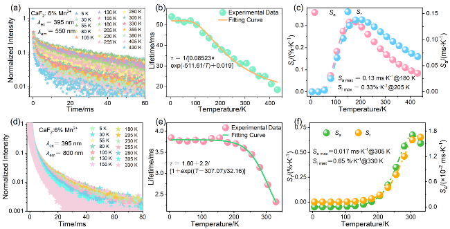 图5 CaF2:6%Mn2+纳米颗粒的(a) Mn2+离子荧光衰减曲线(λex=395 nm, λem=550 nm, 5~430 K)和(d) Mn2+-Mn2+二聚体荧光衰减曲线(λex=395 nm, λem=800 nm, 5~330 K); (b) Mn2+离子荧光寿命和(e) Mn2+-Mn2+二聚体荧光寿命与温度的依赖性; (c) Mn2+离子荧光寿命和(f) Mn2+-Mn2+二聚体荧光寿命测温模式下, 不同温度下的Sa和SrFigure 5 (a) Mn2+ ion luminescent decay curves (λex=395 nm, λem=550 nm, 5~430 K) and (d) Mn2+-Mn2+ dimer luminescent decay curves (λex=395 nm, λem=800 nm, 5~330 K) of CaF2:6%Mn2+ nanoparticles; Temperature-dependent of (b) Mn2+ ion luminescent lifetime and (e) Mn2+-Mn2+ dimer luminescent lifetime; Sa and Sr for (c) Mn2+ ion luminescent lifetime and (f) Mn2+-Mn2+ dimer luminescent lifetime thermometry mode at various temperatures |