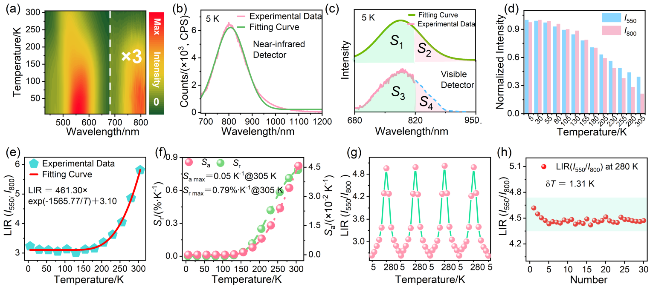 图4 (a) CaF2:6%Mn2+纳米颗粒的二维PL等高线图(λex=395 nm, 5~305 K); (b) 5 K时的近红外PL光谱及其高斯拟合曲线; (c)获取Mn2+-Mn2+二聚体发射积分强度的方法示意图; (d)不同温度下, Mn2+离子与Mn2+-Mn2+二聚体的归一化发射强度直方图; (e) LIR(I550/I800)的温度依赖性及(f)对应的灵敏度; (g)在5~280 K之间经4次加热-冷却循环测量的LIR(I550/I800)值; (h) 280 K下测量30次PL光谱, LIR(I550/I800)值对应的波动情况及计算的δT值Figure 4 (a) 2D PL contour map of CaF2:6%Mn2+ nanoparticles (λex=395 nm, 5~305 K). (b) Near-infrared PL spectrum at 5 K and its Gaussian fitting curve. (c) Diagram illustrating the methodology for determining the integrated emission intensity of Mn2+-Mn2+dimers. (d) Histograms of normalized emission intensity of Mn2+ ions and Mn2+-Mn2+ dimers at different temperatures. (e) Temperature-dependent LIR(I550/I800) values and (f) the corresponding sensitivities. (g) LIR(I550/I800) values measured by 4 heating-cooling cycles between 5~280 K. (h) The corresponding fluctuation of LIR(I550/I800) value obtained from PL spectra measured 30 times at 280 K and calculated δT value |