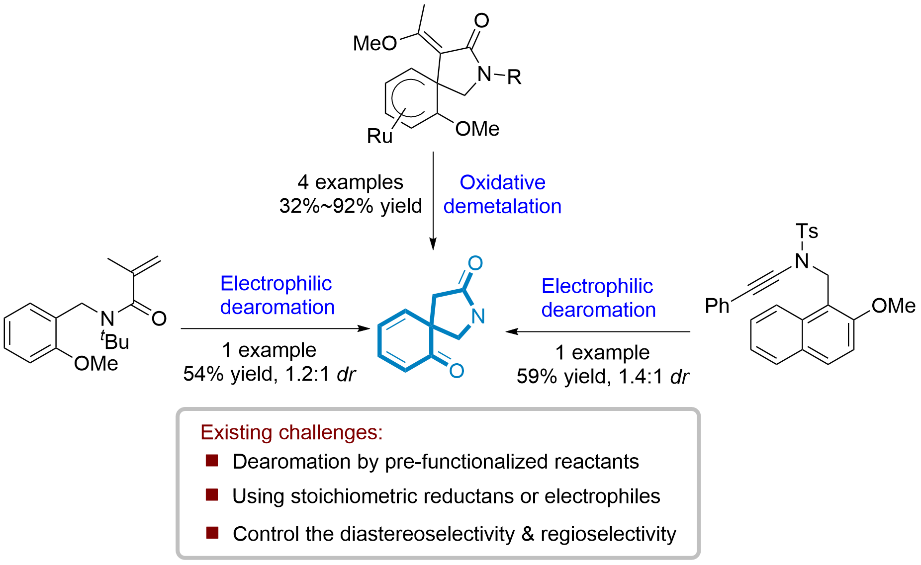 在过去的几十年, 化学工作者发展了两种策略, 用于合成五元内酰胺螺环己二烯衍生物(图式1): 一是利用预先合成的螺环金属配合物发生氧化去金属化构建该类骨架[4], 二是通过邻甲氧基芳环的分子内亲电去芳构化反应合成该类化合物[5]. 基于这两种策略, 该类含氮螺环骨架的构建已经取得了一些进展. 但是, 这两种策略都存在一些挑战性问题: (1)这些反应都需要预先合成结构复杂的底物, 用于发生分子内去芳构化反应; (2)反应通常需要添加化学计量的氧化剂或亲电试剂, 以实现芳环的去芳构化; (3)在构建具有相邻立体中心的螺环骨架时, 难以很好地控制反应的非对映选择性. 因此, 迫切需要发展简单高效的新策略, 以解决这些挑战性问题, 实现该类骨架的高选择性构建.