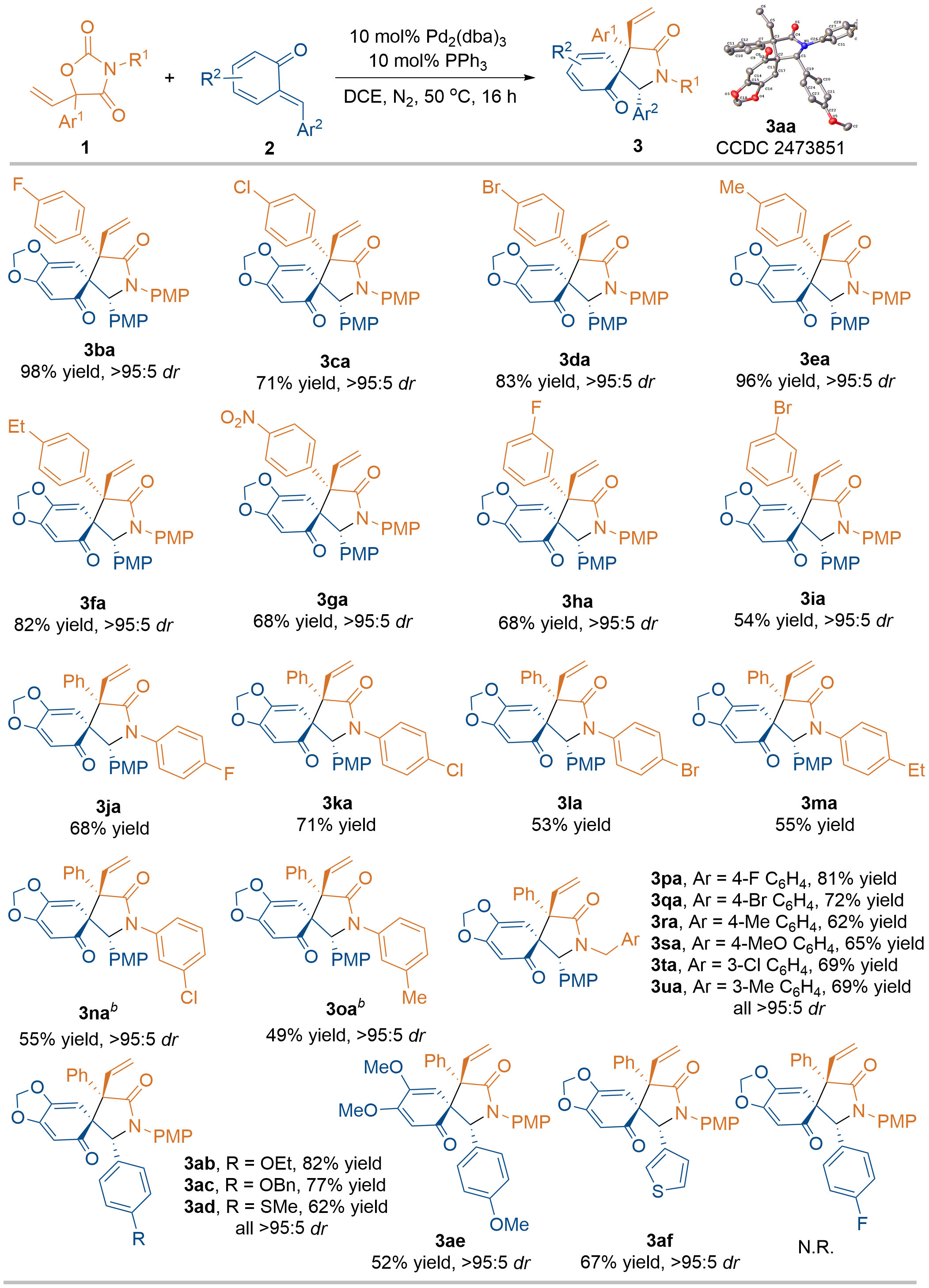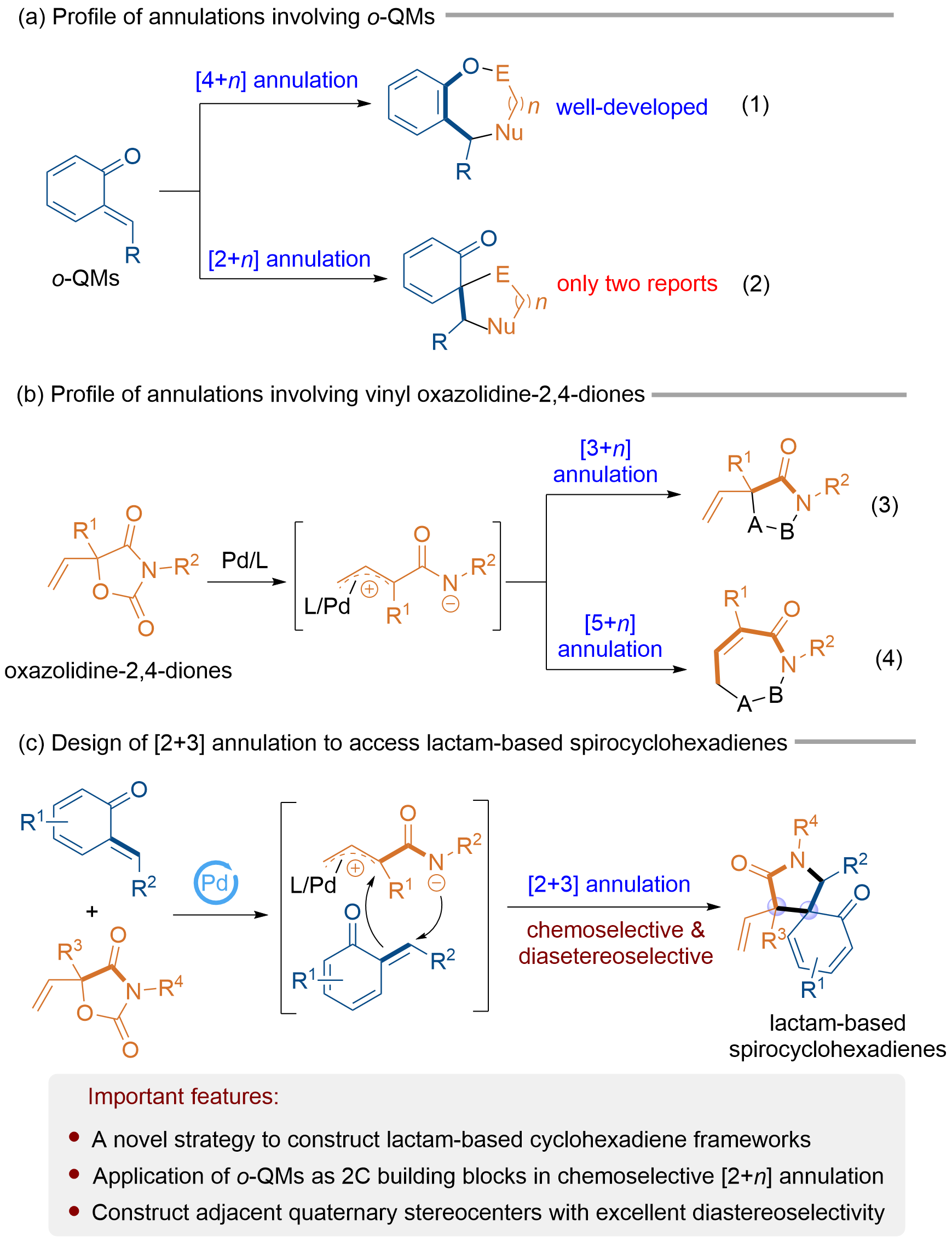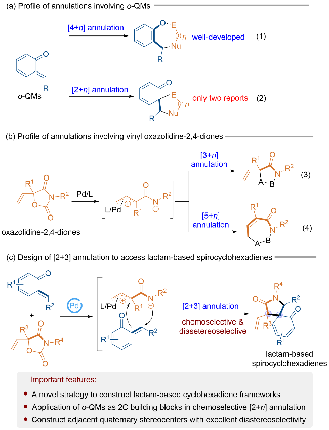 Due to their structural rigidity, spirocyclic compounds have attracted considerable attention from chemists. Among them, five-membered lactam-based spirocyclohexadiene belongs to an important spiro-skeleton, which is found in many bioactive molecules. However, the strategy to construct this class of spiro-skeletons is very limited. Meanwhile, it is challenging to achieve good control over the diastereoselectivity when constructing spirocyclic frameworks with adjacent stereocenters. To solve these challenging issues, in this work, a Pd-catalyzed regioselective [2+3] annulation of o-quinone methides with vinyloxazolidines was established, constructing five-membered lactam-based spirocyclohexadiene skeletons with adjacent quaternary carbon centers in moderate to good yields (49% to 98%) with excellent diastereoselectivities (all >95∶5 dr). After establishing the optimal reaction condition, we evaluated the substrate scope of vinyloxazolidine and o-quinone methides in the [2+3] annulation. In general, all tested substrates exhibit good reaction efficiency to generate lactam-based spirocyclohexadienes in moderate to excellent yields with excellent diastereoselectivities. The successful one-mmol-scale reaction and downstream transformation demonstrated the potential synthetic applications of this transformation. Furthermore, preliminary studies on the catalytic asymmetric [2+3] cyclization reaction demonstrate that the catalytic system of Pd-chiral phosphine ligand could achieve some extent of enantiocontrol of the transformation. This transformation not only expands the application of o-quinone methides as two-atom synthons in annulation reactions but also provides a novel strategy for the efficient and highly diastereoselective construction of five-membered lactam-based spirocyclohexadiene architectures. The general procedure of the [2+3] annulation is as follows: To an oven-dried Schlenk-tube, vinyloxazolidine (30.9 mg, 0.1 mmol), o-quinone methide (30.7 mg, 0.12 mmol), Pd2(dba)3 (9.1 mg, 0.01 mmol), PPh3 (2.6 mg, 0.01 mmol) and dichloroethane (DCE, 1.0 mL) were added under N2 atmosphere. The reaction mixture was stirred at 50 ℃ for 16 h. After completion of the reaction, the reaction mixture was concentrated by vacuum, purified by silica gel chromatography (petroleum ether/ethyl acetate) to yield pure products.