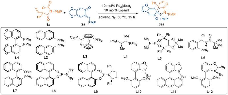 最后, 我们对该反应进行了初步的催化不对称探索(表2). 以乙烯基𫫇唑二酮1a和邻亚甲基苯醌2a为模板底物, 在乙腈中以Pd2(dba)3为催化剂, 我们筛选了一系列手性膦配体. 结果表明, 手性双膦配体会显著抑制环化反应的进行(Entries 1~4), 而手性单磷配体则可以顺利地催化该[2+3]环化反应, 得到含有三个连续手性中心的螺环产物3aa, 获得高的非对映选择性, 但是反应的对映选择性控制却较弱(Entries 5~12). 其中, 以L12[18]为手性膦配体时, 反应表现出了相对较高的对映选择性控制, 以25%产率和42% ee得到目标产物3aa(Entry 12). 为了进一步提升反应的对映选择性, 我们对反应溶剂进行了筛选(Entries 13~16), 发现该反应在其他溶剂中的对映选择性普遍较低. 所以, 初步的不对称催化尝试显示, 钯-手性膦配体催化体系可以在一定程度上控制该[2+3]环化反应的对映选择性, 但是实现该反应的高对映选择性控制仍然是一个巨大的挑战.