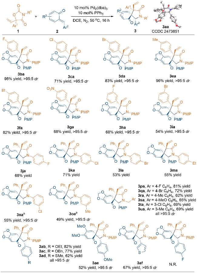 我们首先以乙烯基𫫇唑二酮1a和邻亚甲基苯醌2a为模板底物进行反应尝试, 在Pd2(dba)3催化下, 以三苯基膦为配体, 乙腈作为溶剂, 在50 ℃下反应16 h, 可以以84%的分离产率得到[2+3]环化反应的目标产物3aa, 且产物具有高的非对映选择性(>95∶5 dr)和专一的化学选择性(表1, Entry 1), 并没有观察到[4+3]环化反应的产物3aa'. 其他金属催化剂如铱和铜催化剂则不能催化此[2+3]环化反应(Entries 3~4). 配体对该反应的影响较大, 在一些双齿膦配体存在下, 产物3aa的产率有所降低(Entries 5~6). 随后, 我们研究了溶剂对反应的影响. 在众多溶剂中, 卤类溶剂1,2-二氯乙烷(DCE)表现出了显著的优越性, 可以明显提升产物3aa的收率达95% (Entry 7). 其他大极性溶剂、苯类和醚类溶剂都只能以中等至良好的收率得到产物3aa (Entries 8~11). 最后, 我们尝试升高或降低反应温度, 但是都会使产物3aa的产率降低(Entries 12~13). 因此, 我们将Entry 7确定为反应的最优条件, 在此条件下能够以95%的产率、>95∶5的dr得到目标产物3aa. 值得一提的是, 可能由于五元环具有较小的环张力, 以及受配体影响, 烯丙基钯中间体更易被碳负离子进攻[16]. 在条件优化过程中, 始终没有观察到[4+3]环化产物3aa'. 这显示出该反应具有高的化学选择性. 此外, 相邻季碳中心较大的位阻可能导致反应具有出色的非对映选择性.