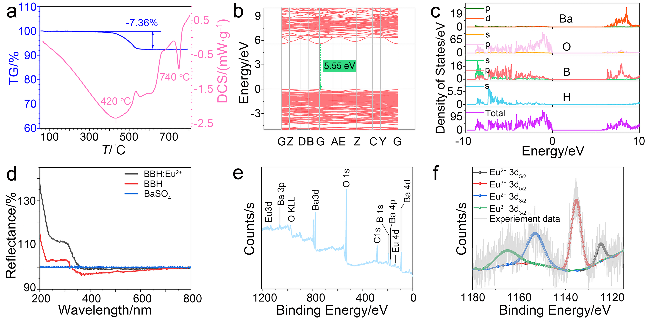 图3b所示. BBH的价带顶与导带底均位于布里渊区Γ点, 表明该材料为直接带隙半导体, 且具有较大的带隙宽度(5.55 eV). 若发光材料基质的带隙较小, Eu