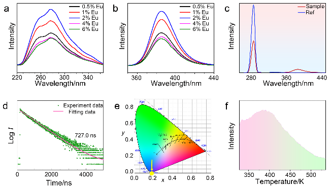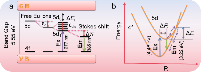 2⁺的激发态d轨道可能接近基质导带, 从而引发温度诱导的光电离或电荷转移过程, 进而影响荧光粉的热稳定性. 因此, 具有较大带隙的基质材料通常有利于提升荧光粉的荧光热稳定性. 但荧光热稳定性由多种因素决定, 具体情况应具体分析.