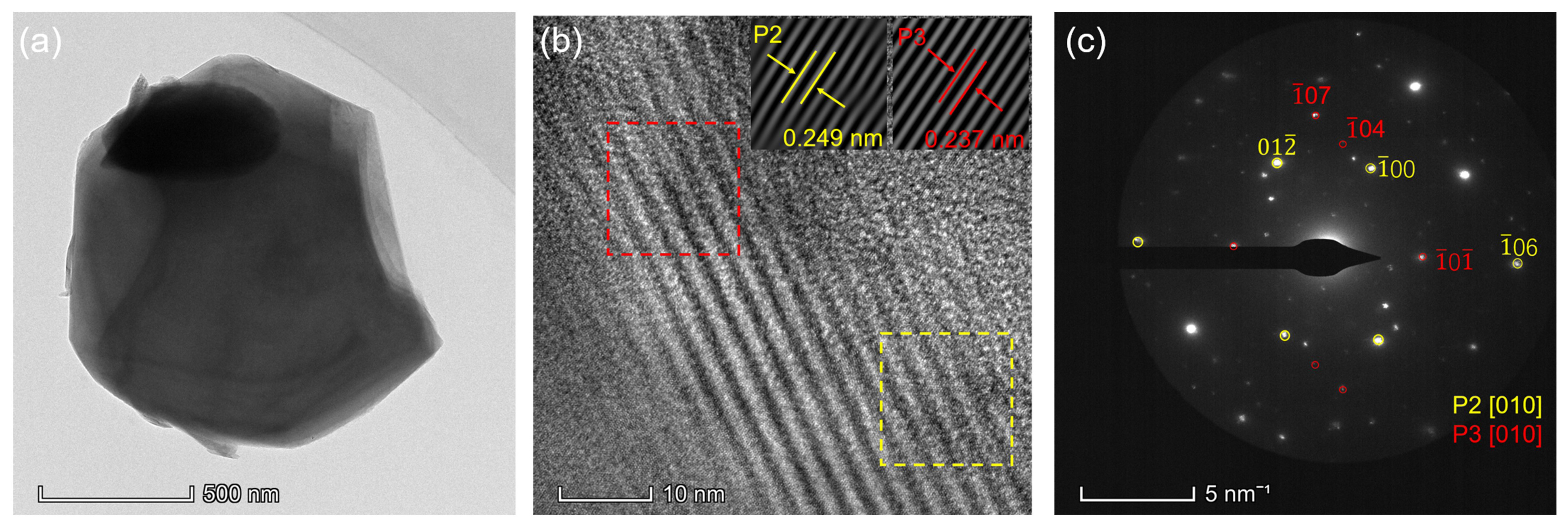 c轴, 这表明P2相材料的层间间距比P3相更窄, 这可能是由于较高的温度促使Ni—O键断裂或重组, 正极材料中的钠层滑移, 过渡金属层的堆叠顺序从ABBCCA (P3相)转变为ABBA (P2相)