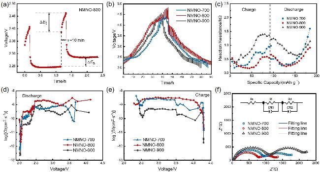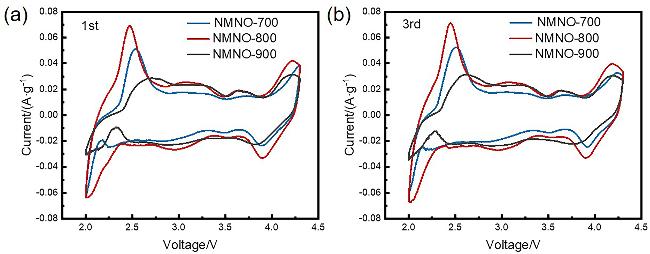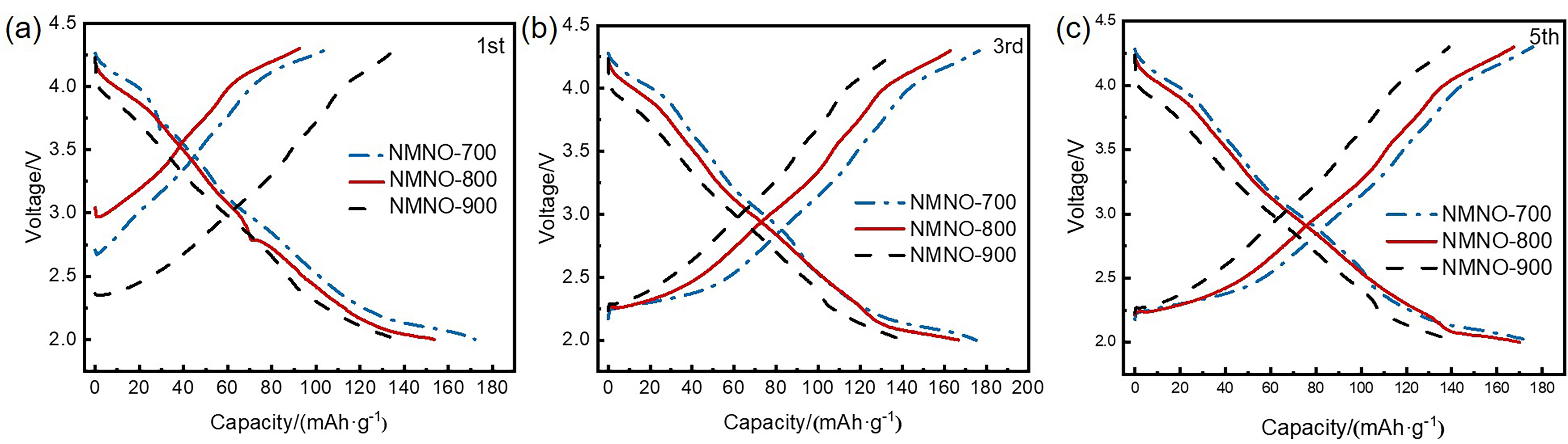 2正极材料, 利用X射线衍射(XRD)分析煅烧温度对材料的晶体结构的影响规律. NMNO-700、NMNO-800和NMNO-900的XRD谱图如