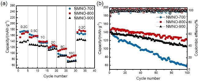 c=1.129538 nm), 清楚地反映了随着煅烧温度的升高, 材料逐渐从P3相转变为P2相. 另外, 纯P2相NMNO-900的