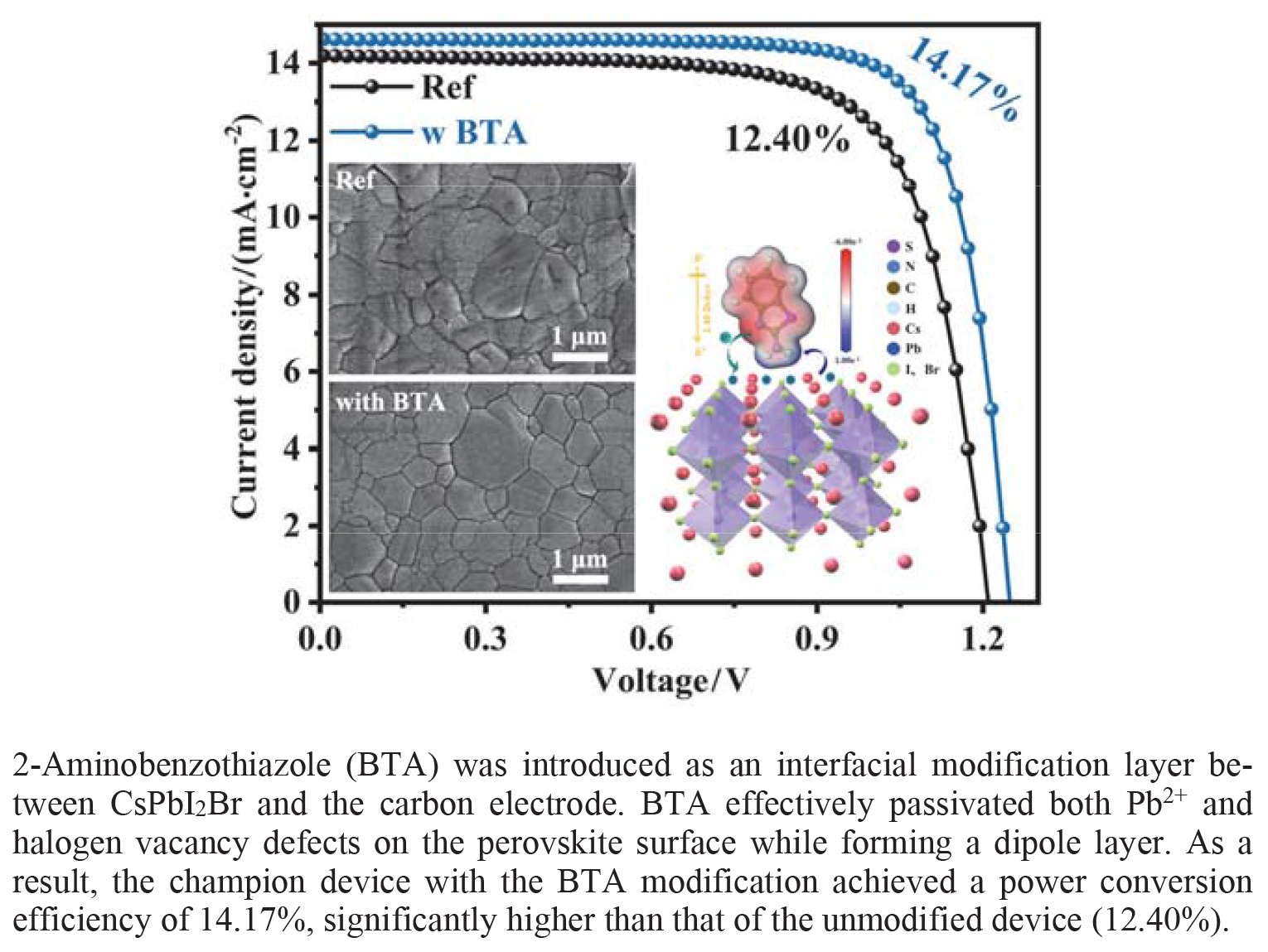 封面介绍Wu, Jihuai & Lan, Zhang et al. on page 223-230: In this study, 2-aminobenzothiazole (BTA) was introduced as a multifunctional molecular bridge. BTA forms an electric dipole layer at the interface, which facilitates efficient hole extraction and transport, thereby significantly enhancing the performance and stability of CsPbI2Br devices. This demonstrates that BTA interface modification is an effective strategy for improving photovoltaic performance and stability. In the future, screening molecules with stronger dipole moments could further optimize the interface performance, promoting the development of such low-cost, high-efficiency, and stable inorganic perovskite solar cells.