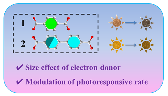 The monitoring and regulation of the photoresponsive rate of electron transfer (ET)-based photochromic coordination polymers is of great importance for optimizing photochromic performances, but remain a huge challenge. In this work, two novel two-dimension (2D) CPs, [Zn2(3-DPNDI)2(p-BDC)(p-HBDC)2]•[3-DPNDI]2 (1) and [Zn(3-DPNDI)(BPC)]•H2O (2) have been constructed through the integration of N,N′-di-(3-pyridyl)-1,4,5,8-naphthalene diimide (3-DPNDI, electron acceptor), Zn(NO3)2 (metal node) and terephthalic acid/4,4'-biphenylphthalic acid (p-H2BDC/H2BPC, electron donor). The single-crystal structures of 1 and 2 were confirmed and analyzed by single-crystal X-ray diffraction (SC-XRD), the purity and thermal stability of the single-crystal samples were evaluated by powder X-ray diffraction (PXRD) and thermogravimetry (TGA), the photochromic properties were studied by ultraviolet-visible absorption spectroscopy (UV-Vis), and the mechanism of photochromism was determined using electron paramagnetic resonance spectroscopy (EPR). Under ultraviolet lamp irradiation (Hg lamp, 365 nm), 1 can undergo a fast color change from pale brown to black within 1 s and reached saturation in 10 min, while 2 displays a slow color transformation from yellow to brown within 5 s and saturated time is about 1 h. To evaluate the photoresponsive rate more accurately and effectively, a new method was proposed (i.e. photoresponsive rate=ΔAbs/time, unit, s-1). By means of above equation, the photoresponsive rate of 1 is 0.02 s-1, while that of 2 is only 0.0024 s-1. The photoresponsive rate of 1 is approximately one order of magnitude faster than that of 2. Meanwhile, photoresponsive rates of 1 and 2 were further calculated using the kinetic equations. The kinetic constant k1 for 1 is 0.13 s-1, which is much greater than that of 2 (0.003 s-1), further confirming the accuracy of the above-mentioned calculation method. This study demonstrates the significant influence of size effect of ligand on the interfacial contacts of electron donors/acceptors, pho-toinduced intermolecular ET and the photoresponsive rate, which provides an effective strategy for the controllable construction of photochromic CPs.