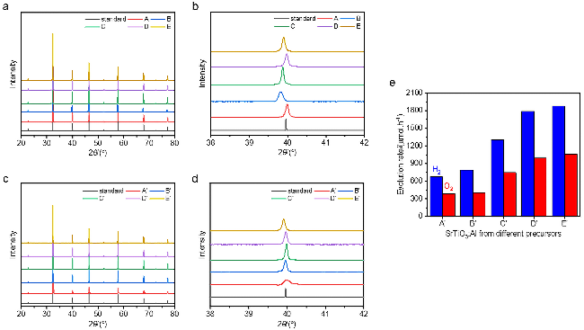 图7 前驱体SrTiO3的XRD衍射图(a); (b)是图(a)部分区域的放大XRD图; 各类2%-SrTiO3:Al的XRD衍射图(c)和光催化全分解水活性(e); (d)是图(c)部分区域的放大XRD图; 光催化活性测试条件: 130 mg光催化剂分散于100 mL去离子水中, 助催化剂的负载为0.1% (w) Rh-0.05% (w) Cr2O3-0.05% (w) CoOOHFigure 7 (a) XRD patterns of the SrTiO3 precursors. (b) Enlarged XRD patterns in (a). XRD patterns (c) and photocatalytic overall water splitting activities (e) of the corresponding 2%-SrTiO3:Al samples. (d) Enlarged XRD patterns in (c). Photocatalytic reaction conditions: 130 mg of photocatalyst loaded with 0.1% (w) Rh, 0.05% (w) Cr2O3, 0.05% (w) CoOOH, dispersed in 100 mL deionized water |