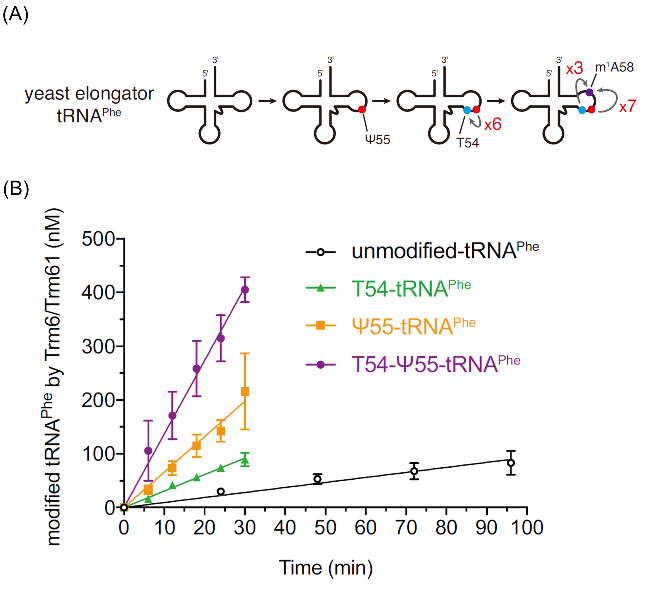 图3 Ψ55、m5U54及m1A58之间的互作. (A)Ψ55、m5U54及m1A58引入的先后顺序; (B)Trm6/Trm61催化含有Ψ55、m5U54的tRNA A58甲基化的速率差别. 图3来自参考文献[21]Figure 3 Figure 3 Cross-talk between Ψ55, m5U54 and m1A58. (A) The introduce order of Ψ55, m5U54 and m1A58 in tRNA. (B) The methylation rate of tRNA A58 containing Ψ55 or m5U54 catalyzed by Trm6/Trm61. was adapted from ref. [21]. Available under a CC-BY license. Copyright 2023, The Authors |