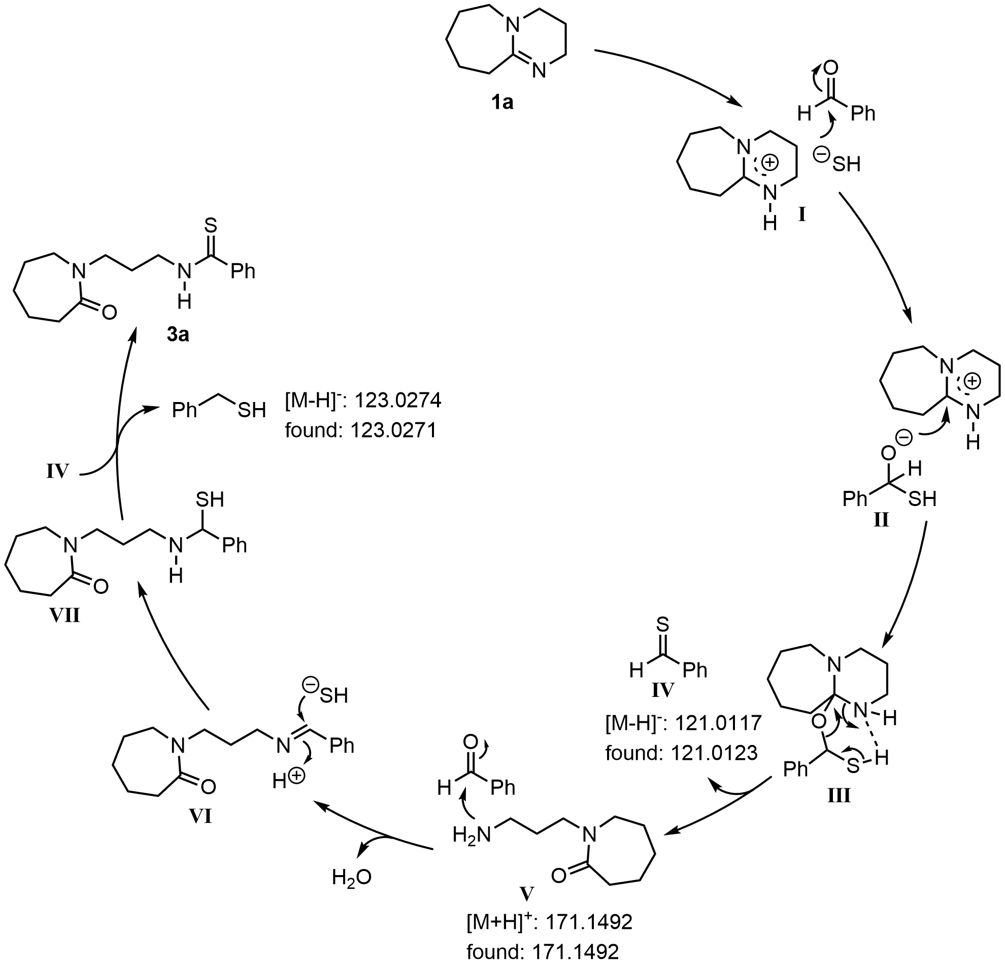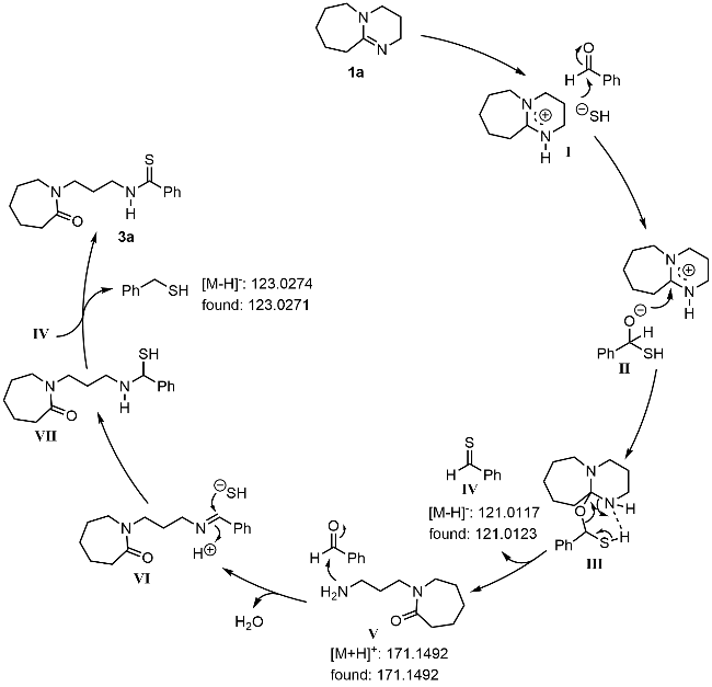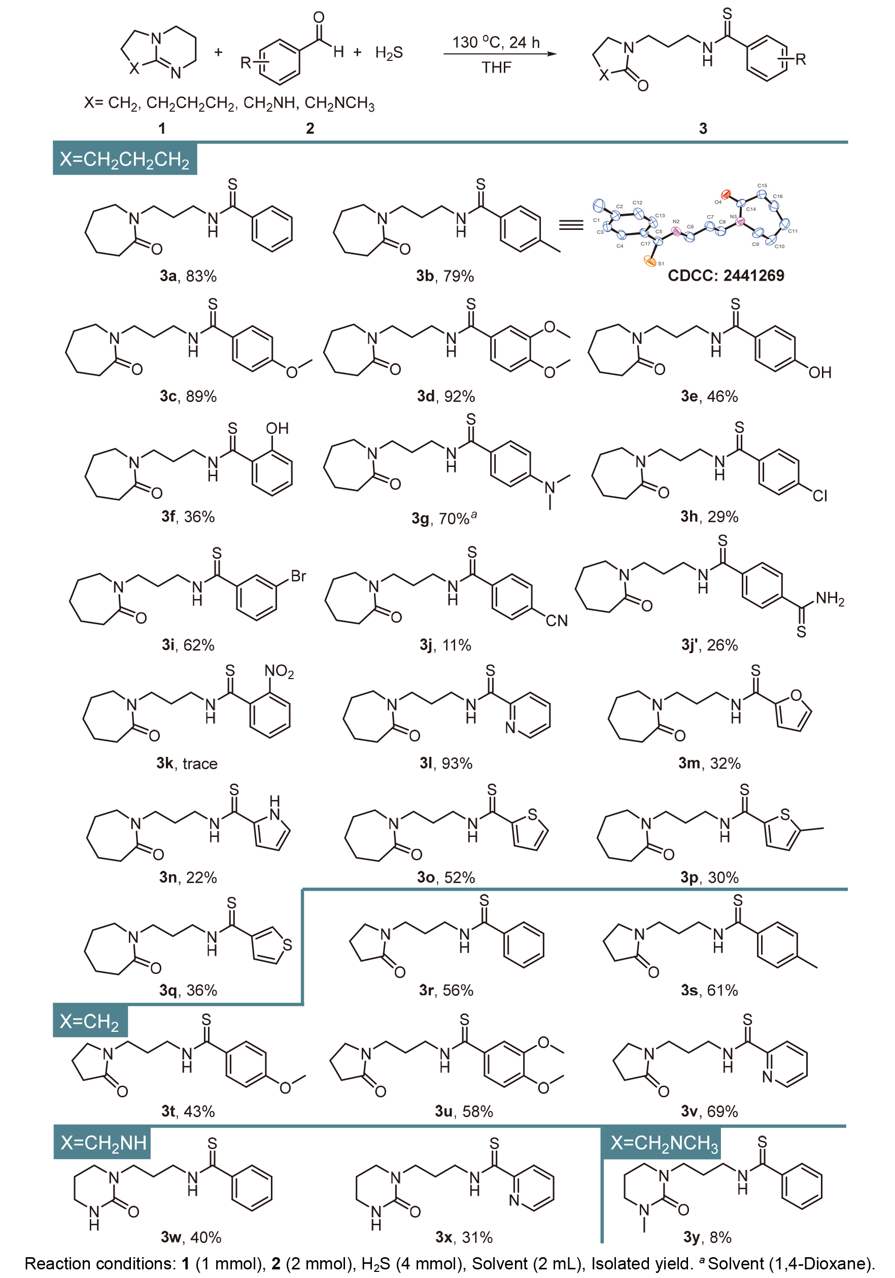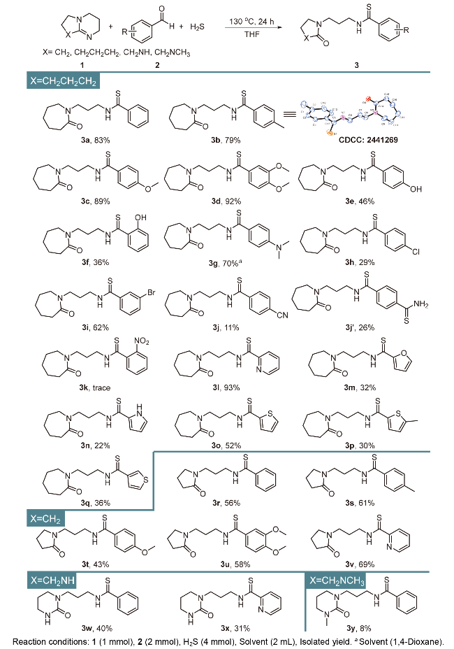 Thioamides, an important functional molecular skeleton, have wide application in the fields of pesticides and pharmaceuticals. They also serving as key intermediates for synthesizing sulfur-containing fine chemicals. This study has developed an efficient method for synthesizing novel thioamide derivatives using cyclic amidines (CA), benzaldehyde, and H2S as starting materials. Notably, H2S was utilized as the sulfur source instead of traditional sulfur reagents, enabling the successful synthesis of a variety of novel thioamide derivatives. In addition, the reaction mechanism was elucidated through in situ infrared spectroscopy, which revealed a multi-step reaction process. Initially, the cyclic amidine reacts with H2S to form a CAH⁺HS⁻ intermediate. Subsequently, the HS⁻ anion nucleophilically attack the carbonyl group of benzaldehyde to form an active intermediate containing an oxygen anion. This intermediate then nucleophilically attacks CAH⁺, generating a C—O—C key intermediate, which undergoes intramolecular rearrangement to produce lactam and thiobenzaldehyde. Ultimately, a series of novel thioamide derivatives were efficiently constructed through this tandem three-component reaction. This study demonstrates for the first time that the oxygen atom in benzaldehyde exhibits a dual function. It serves as a nucleophile to attack CAH⁺ and initiate ring-opening reaction of cyclic amidines, while simultaneously promoting oxygen atom migration to the lactam through intramolecular rearrangement. This discovery provides a novel approach for the design and synthesis of sulfur-containing fine chemicals. A typical general procedure for the synthesis of thioamides is described as follows: As an example, the procedure for the synthesis of thioamides from the starting matiarials H2S, 1,8-diazabicyclo[5.4.0]- 7-undecene (DBU, 1a) and benzaldehyde (2a) is described, and similar methods are applied to other substrates. 1a (0.1520 g, 1.0 mmol), 2a (0.2120 g, 3.0 mmol), and tetrahydrofuran (THF, 2 mL) were loaded into a 15 mL stainless-steel autoclave equipped with a magnetic stirrer. Subsequently, the reactor was charged with H2S (89.6 mL, 4.0 mmol). The reactor was placed in a constant-temperature sand bath, and the reaction mixture solution was stirred for 24 h. After the reaction was completed, a saturated NaCl aqueous solution was added to the reaction mixture solution, followed by extraction with EtOAc three times. The combined organic layer was washed with brine and dried over anhydrous MgSO4, filtered, and concentrated under reduced pressure. The crude product was then purified by silica gel column chromatography (V(petroleum ether)/V(ethyl acetate)=1/1) to give the desired product N-(3-(2-oxoazepan-1-yl)propyl)benzothioamide (3a).