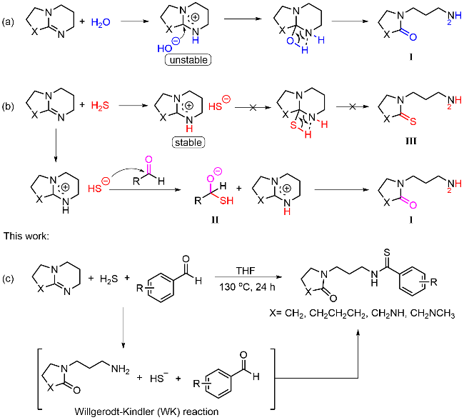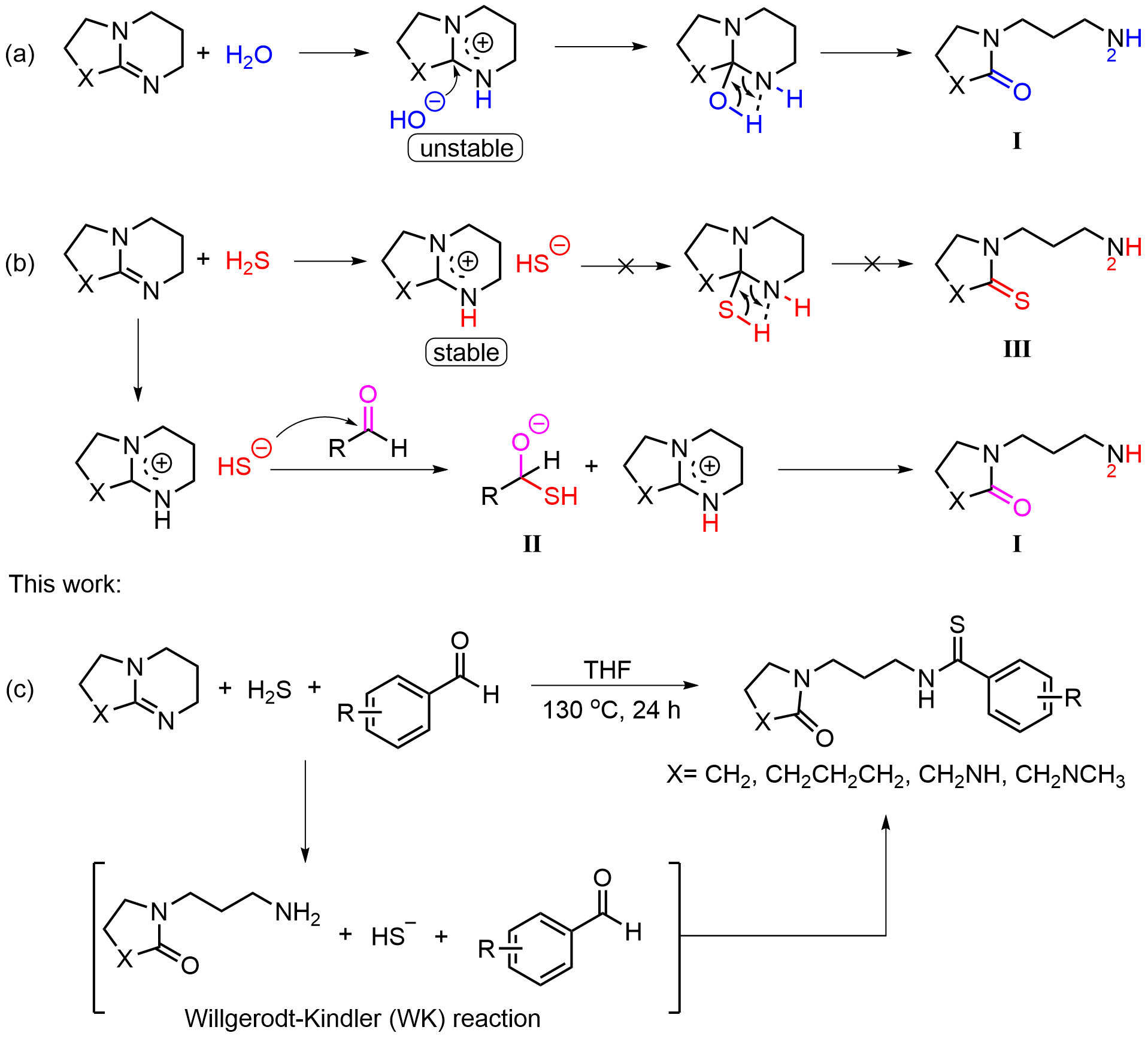 图式3 环脒、醛和H2S的三组分反应构建硫代酰胺
