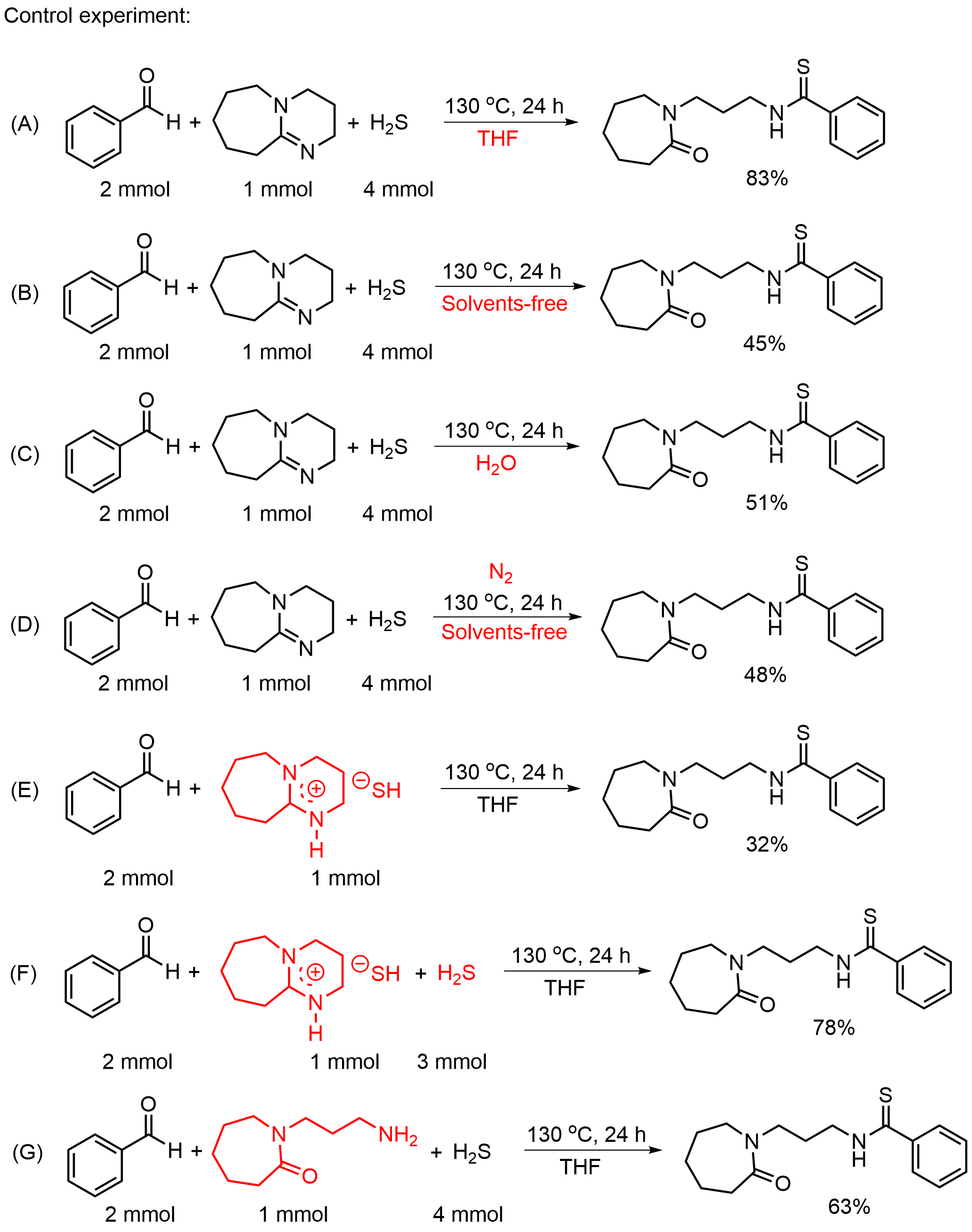 本研究以DBU (1a)和苯甲醛(2a)为模型底物, H2S为硫源, 系统考察了投料比、温度、溶剂和时间对反应的影响规律(Table 1). 首先对投料比进行了优化(Table 1, Entries 1~8), 实验结果表明, 当DBU、苯甲醛和H2S的投料物质的量比为1∶2∶4时, 反应产率最高达83% (Table 1, Entry 4). 随后考察了温度对反应的影响规律(Table 1, Entries 4, 9~14), 随着反应温度升高, 产率呈现先增加后减小的趋势. 当反应温度升高至130 ℃时, 反应产率高达83% (Table 1, Entry 4). 由于该反应涉及气液两相体系, 溶剂的选择至关重要. 实验发现, 四氢呋喃(Table 1, Entry 4)、1,4-二氧六环(Table 1, Entry 15)等醚类溶剂表现出良好的反应效果. 相比之下, 聚乙二醇400 (Table 1, Entry 16)作为溶剂时, 由于其高粘度不利于反应进行, 反应产率只有20%. 当使用N,N-二甲基甲酰胺(DMF)作为溶剂时(Table 1, Entry 17), 产率降低至8%, 且在分离过程中检测到N,N-二甲基硫代苯甲酰胺, 推测原因可能是DMF在高温下分解生成二甲胺, 二甲胺会与苯甲醛、H2S反应生成N,N-二甲基硫代苯甲酰胺, 使反应产率降低. 当溶剂为N-甲基吡咯烷酮(NMP)时(Table 1, Entry 18), 产率只有35%. 由于二甲基亚砜(DMSO)本身具有氧化性, 其作为溶剂可能将苯甲醛氧化为苯甲酸[53], 导致没有产物生成(Table 1, Entry 19). 当溶剂为乙腈时(Table 1, Entry 20), 其腈基易受HS⁻亲核进攻, 不利于反应进行. 综合比较, 最终选定THF作为最佳反应溶剂. 最后, 考察了反应时间对产率的影响规律(Table 1 Entry 4, 21~23). 结果表明, 随着反应时间延长, 产率呈现先增加后趋于平稳的趋势, 当反应时间达到24 h时, 产率稳定在83%.