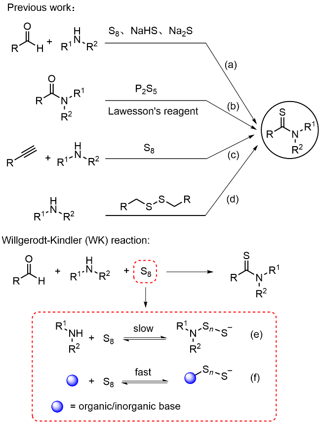 目前, 已报道了多种合成硫代酰胺类化合物的方法(Scheme 2): (a)醛、胺和硫源组成的Willgerodt-Kindler (WK)反应[18-21]; (b)酰胺与五硫化二磷或劳森试剂之间的氧硫交换反应[22-24]; (c)炔烃、胺与硫磺反应[25-26]; (d)二硫化物与胺反应[27-28]等. 其中, WK反应是以醛、胺、硫磺为原料合成硫代酰胺的经典方法. 该反应体系通常以硫磺(S8)作为硫源, 尽管S8可通过开环形成多硫阴离子作为活性亲核试剂, 但其自发解离速率较慢[29-31] (Scheme 2e). 为加速多硫阴离子的生成, 通常会在反应中加入碱性助剂或催化剂以活化S8形成多硫阴离子[32-36](Scheme 2f). 因此, 如何高效合成硫代酰胺成为众多科研工作者的重要研究课题[32,37-39].