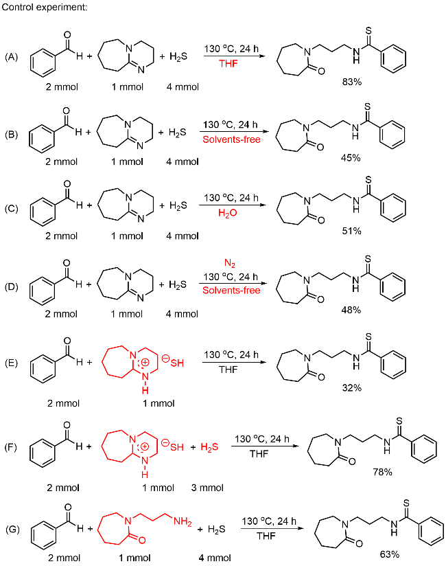 Reaction conditions: DBU (1.0 mmol.), Solvent: THF (2 mL). a Feed ratio (mmol)=DBU∶Benzaldehyde∶H2S; b Isolated yield; c1,4-Dioxane (2 mL); d PEG400 (2 mL); e DMF (2 mL); f NMP (2 mL); g DMSO (2 mL); h CH3CN (2 mL).