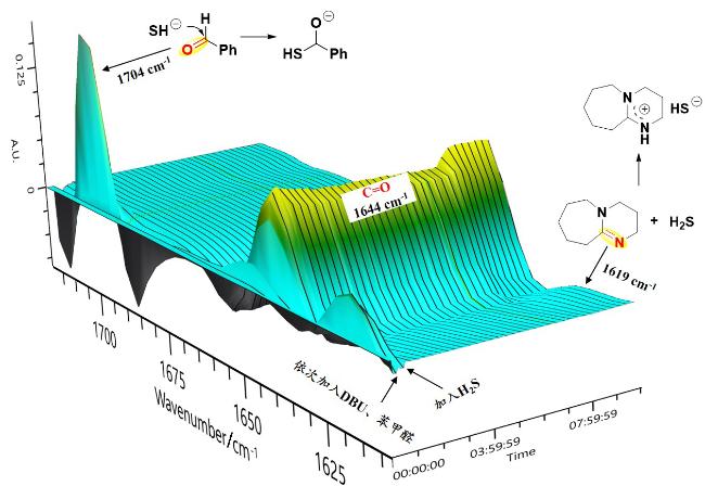 为深入探究反应机理, 本研究采用原位红外对反应中间体进行了实时监测. 如图1所示, 在反应釜中依次加入DBU和苯甲醛, 在1619 cm⁻1处观察到DBU的 C=N伸缩振动峰, 此外, 在1704 cm⁻1处为醛基C=O伸缩振动峰. 随后, 向两者的混合溶液中通入H2S气体, 结果显示通入H2S后DBU的C=N伸缩振动峰迅速消失, 推测DBU与H2S反应生成了DBUH⁺HS⁻中间体. 同时, 在1704 cm⁻1处的醛基C=O伸缩振动峰也在通入H2S后迅速消失, 由此推测HS⁻与苯甲醛发生亲核反应, 使C=O键断裂. 进一步分析发现, 在917 cm⁻1处(图2)出现了C—S键的特征信号峰, 表明C—S键的形成. 此外, 在1249 cm⁻1处观察到C—O—C不对称伸缩振动峰(图3), 推测该峰来源于苯甲醛中间体与DBUH⁺进一步反应生成的中间体. 值得注意的是, C—O—C键的信号峰在刚通入H2S时强度较弱, 但随着反应温度升高, 其强度逐渐增强, 表明温度对该中间体的生成具有显著影响. 随着反应的进行, 在1644 cm⁻1处(图1)出现了酰胺类C=O键的伸缩振动峰, 表明此时已形成含有酰胺结构的中间体. 为验证这一结果, 本研究对比了目标产物3a的原位红外谱图(图4), 在1610~1660 cm⁻1范围内观察到3a产物中己内酰胺C=O键的伸缩振动峰, 与反应液在1644 cm⁻1处出现的C=O键伸缩振动峰一致. 综上所述, 通过原位红外监测, 本研究揭示了反应过程中关键中间体的生成与转化, 为阐明反应机理提供了有力证据.