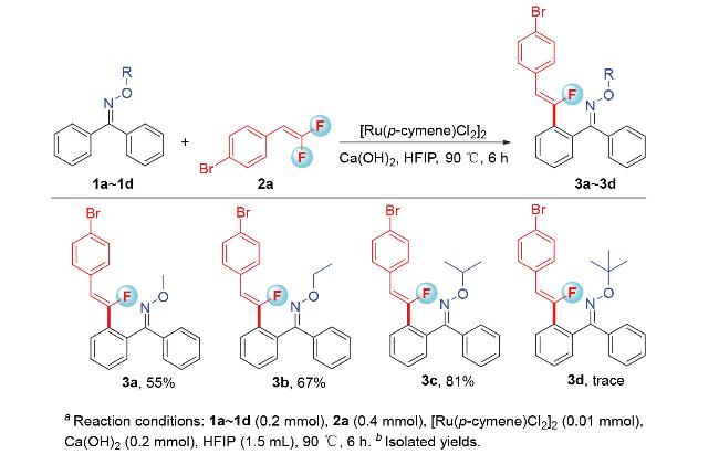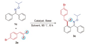 a Reaction conditions: 1c (0.2 mmol), 2a (0.4 mmol), catalyst (0.01 mmol), base (0.2 mmol), solvent (1.5 mL), 90 ℃, 6 h. b Isolated yields. c r.t. d 60 ℃. e 100 ℃. f 2 h. g 12 h. h Using 0.1 mmol Cs2CO3. DBU=1,8-diazabicyclo- [5.4.0]undec-7-ene. |