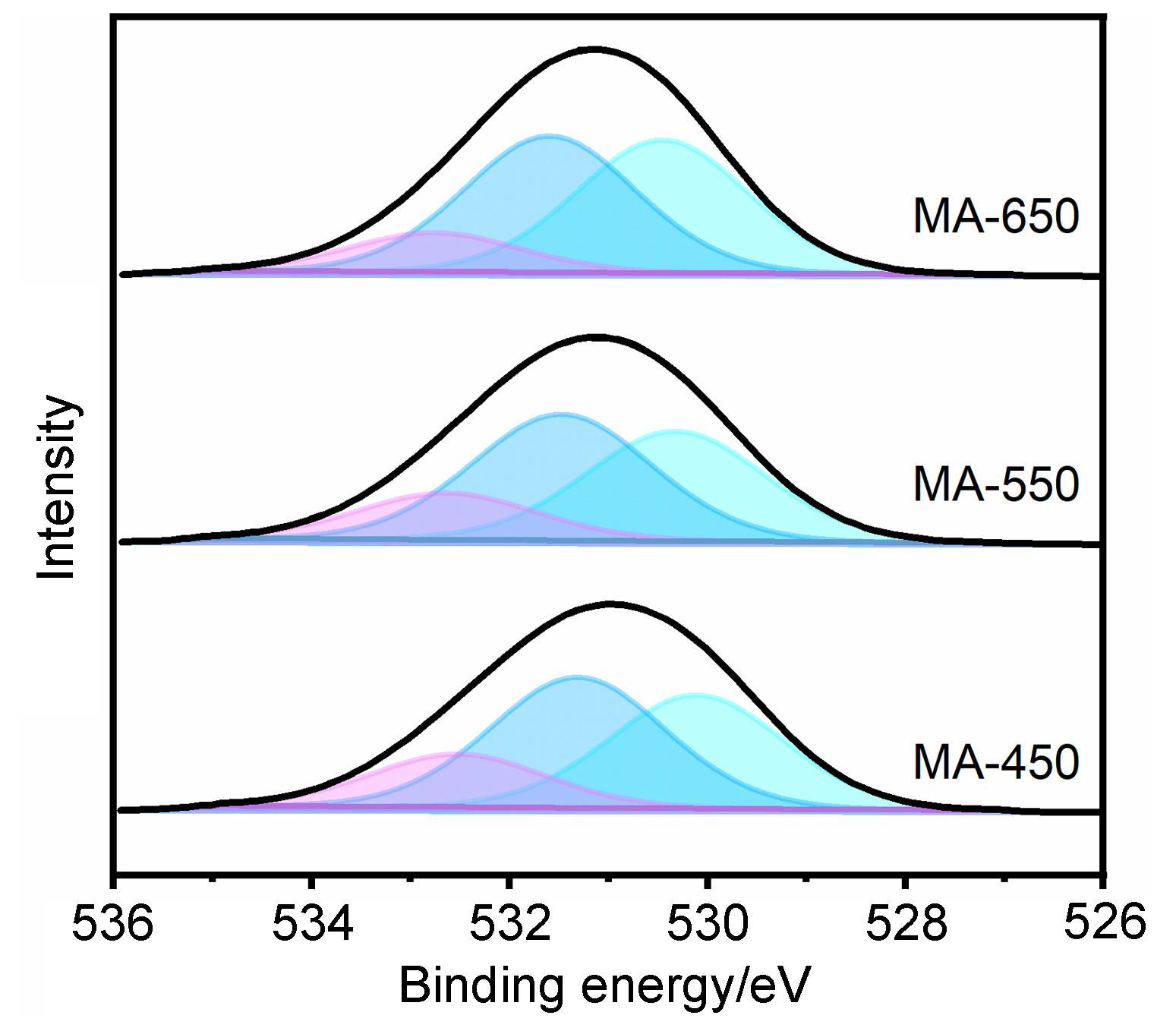 图7 载体MA-450、MA-550和MA-650的O 1s XPS图谱Figure 7 O 1s XPS spectra of supports MA-450, MA-550, and MA-650 |